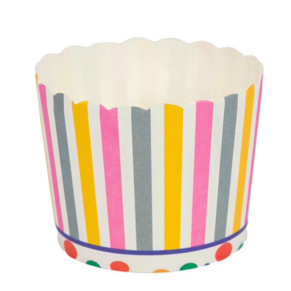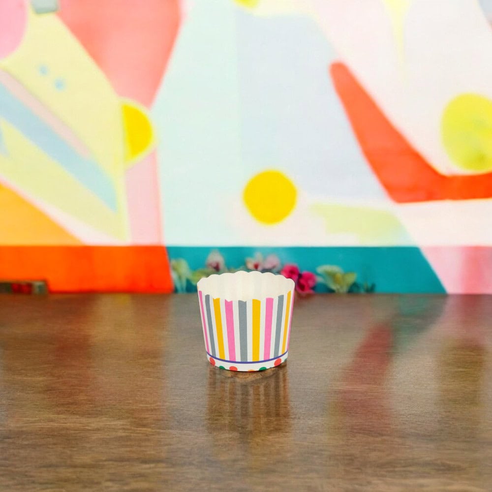 Cutie mică rotundă deschisă cu design - model 3 dungi, oferă o soluție practică și estetică pentru ambalarea deserturilor sau altor mici produse la evenimente speciale. Fiecare cutie are un design atractiv, care adaugă un plus de originalitate și culoare fiecărei ocazii.