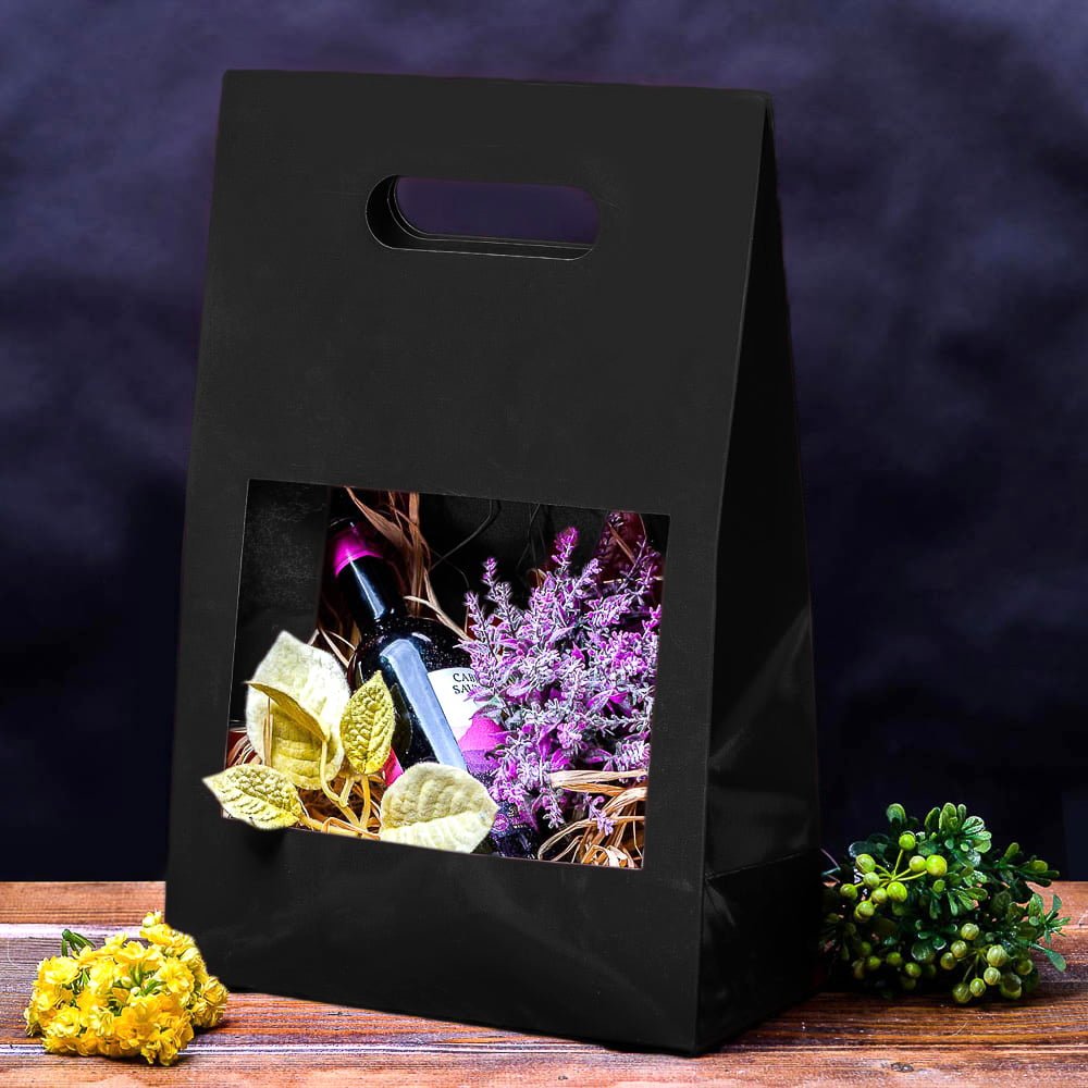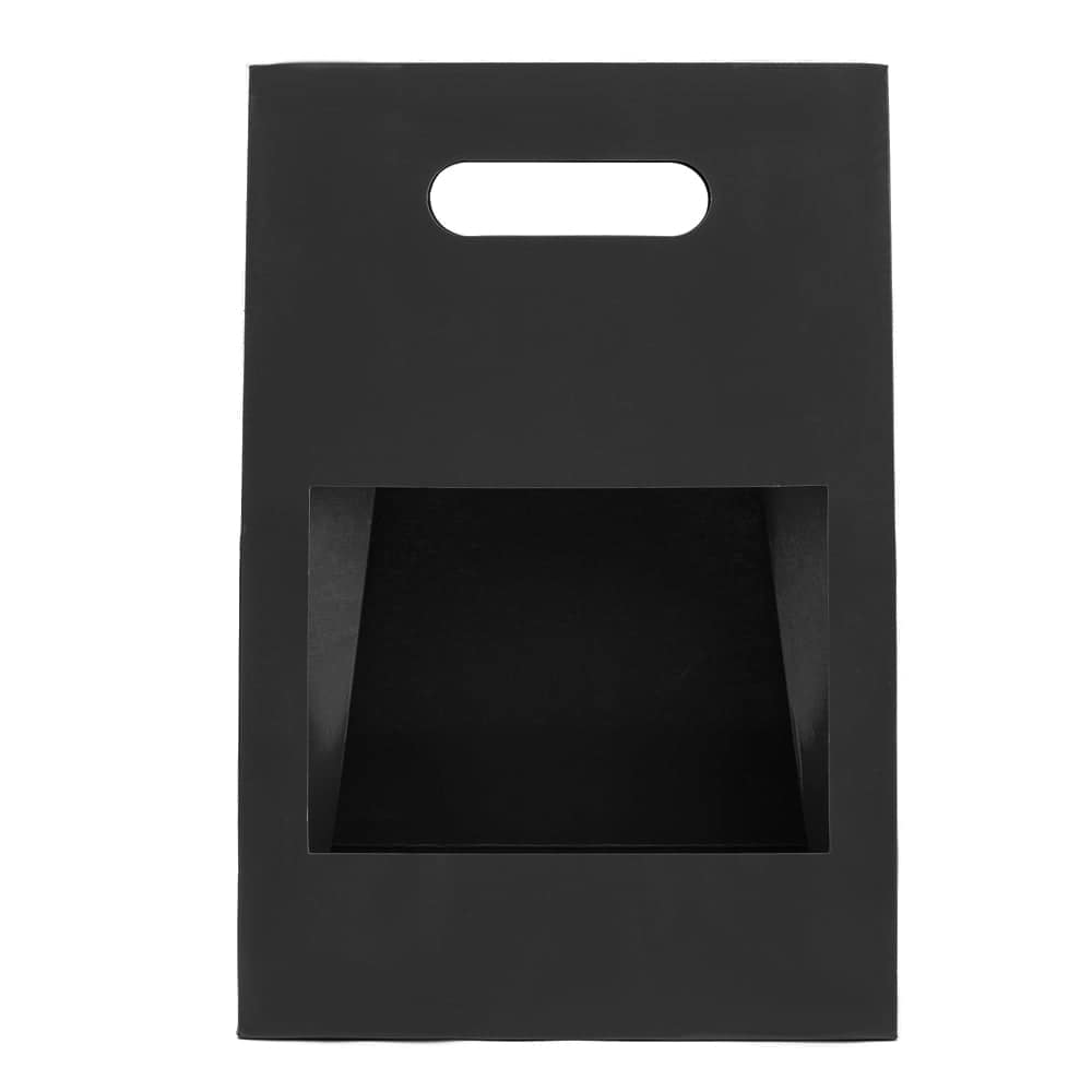 Cutii cu fereastră și mâner - negru, dimensiune 37,5x25x12cm, soluția perfectă pentru ambalarea și prezentarea elegantă a produselor tale.