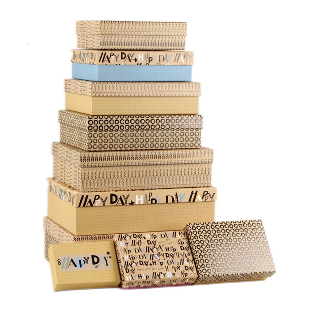 Set 10 cutii dreptunghiulare diferite - model 4 Happy Birthday, perfecte pentru a crea cadouri personalizate și memorabile de ziua de naștere. Cu un design simplu, dar elegant, și un mesaj vesel, aceste cutii sunt o alegere excelentă pentru a împacheta orice tip de cadou, de la bijuterii și cosmetice până la jucării și dulciuri.