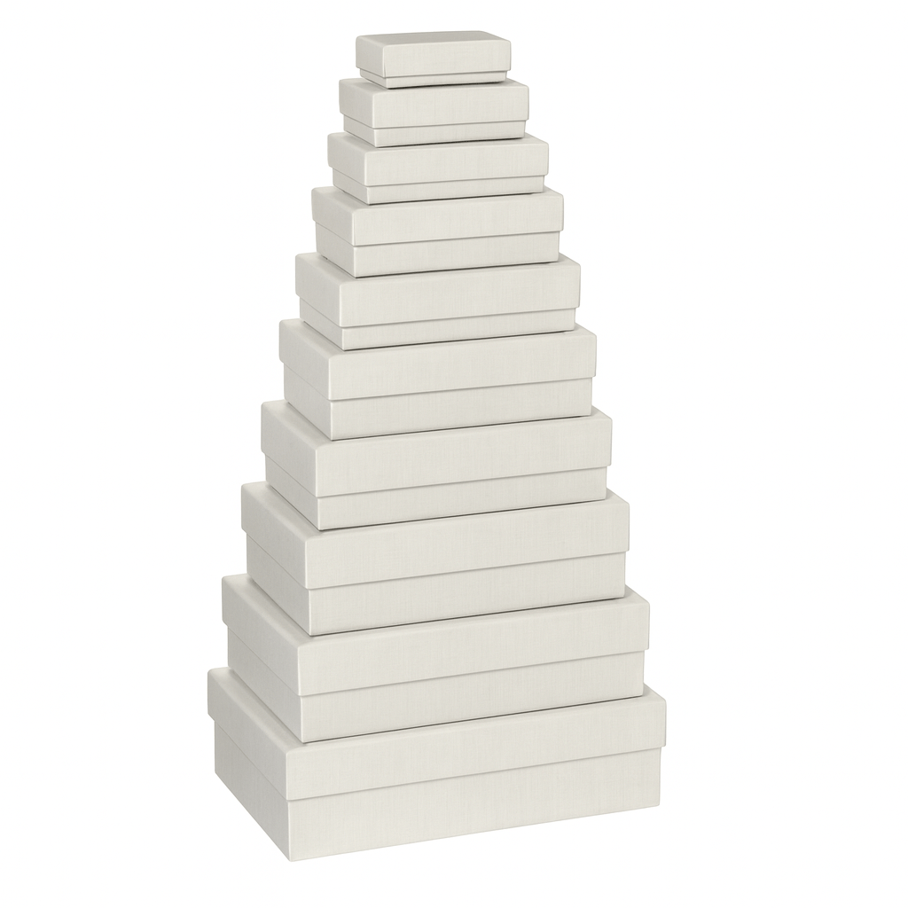 Set 10 cutii dreptunghiulare uni - alb, oferă o soluție elegantă și practică pentru organizarea și ambalarea unei game variate de obiecte. Fabricate dintr-un material robust, cutiiile sunt disponibile într-o gamă de dimensiuni, permițându-ți să găsești dimensiunea perfectă pentru fiecare nevoie. Designul simplu și culoarea albă le fac ușor de integrat în orice decor.