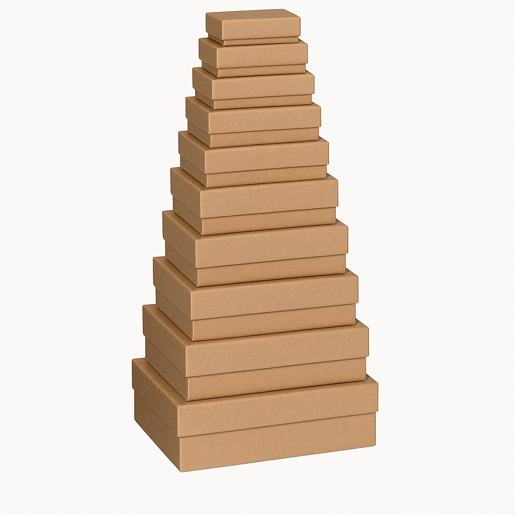 Set 10 cutii dreptunghiulare uni - kraft, oferă o soluție elegantă și practică pentru organizarea și ambalarea unei game variate de obiecte. Fabricate dintr-un material robust, cutiiile sunt disponibile într-o gamă de dimensiuni, permițându-ți să găsești dimensiunea perfectă pentru fiecare nevoie. Designul simplu și culoarea kraft le fac ușor de integrat în orice decor.