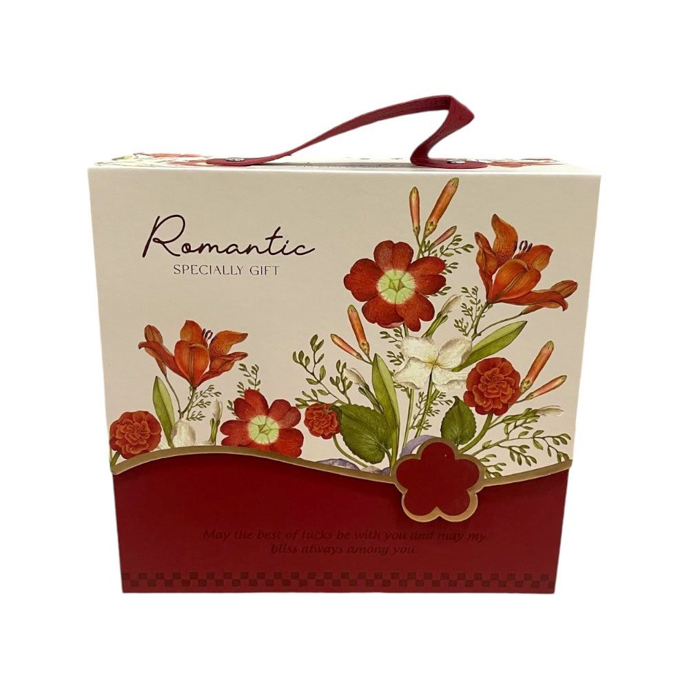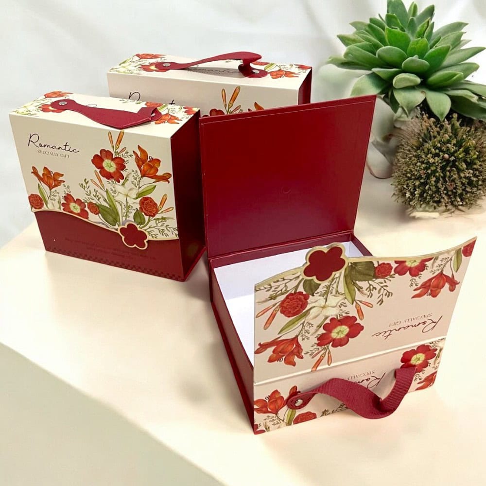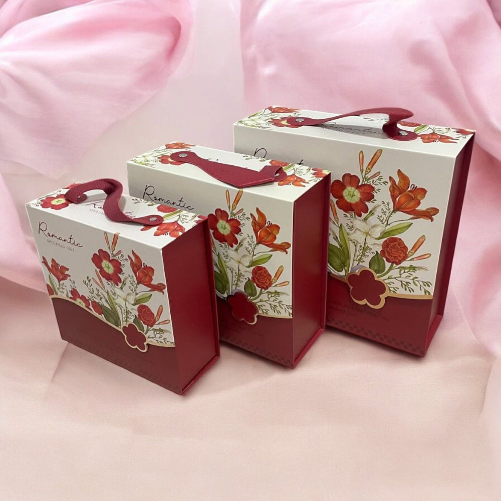 Set 3 cutii stil gentuță pentru cadouri cu mâner - model 2 roșu , oferă o modalitate rafinată și practică de a prezenta darurile dvs. Cu un design floral delicat și mânere convenabile, aceste cutii adaugă o notă de eleganță oricărui cadou.