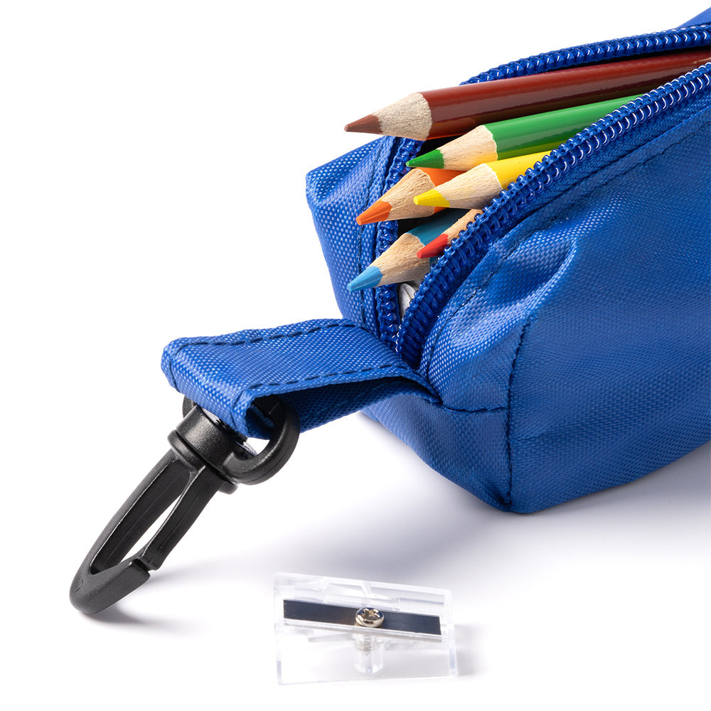 • Penarul contine o ascutitoare si 8 creioane colorate (maro, rosu, portocaliu, galben, verde, albastru deschis, albastru inchis si negru)
