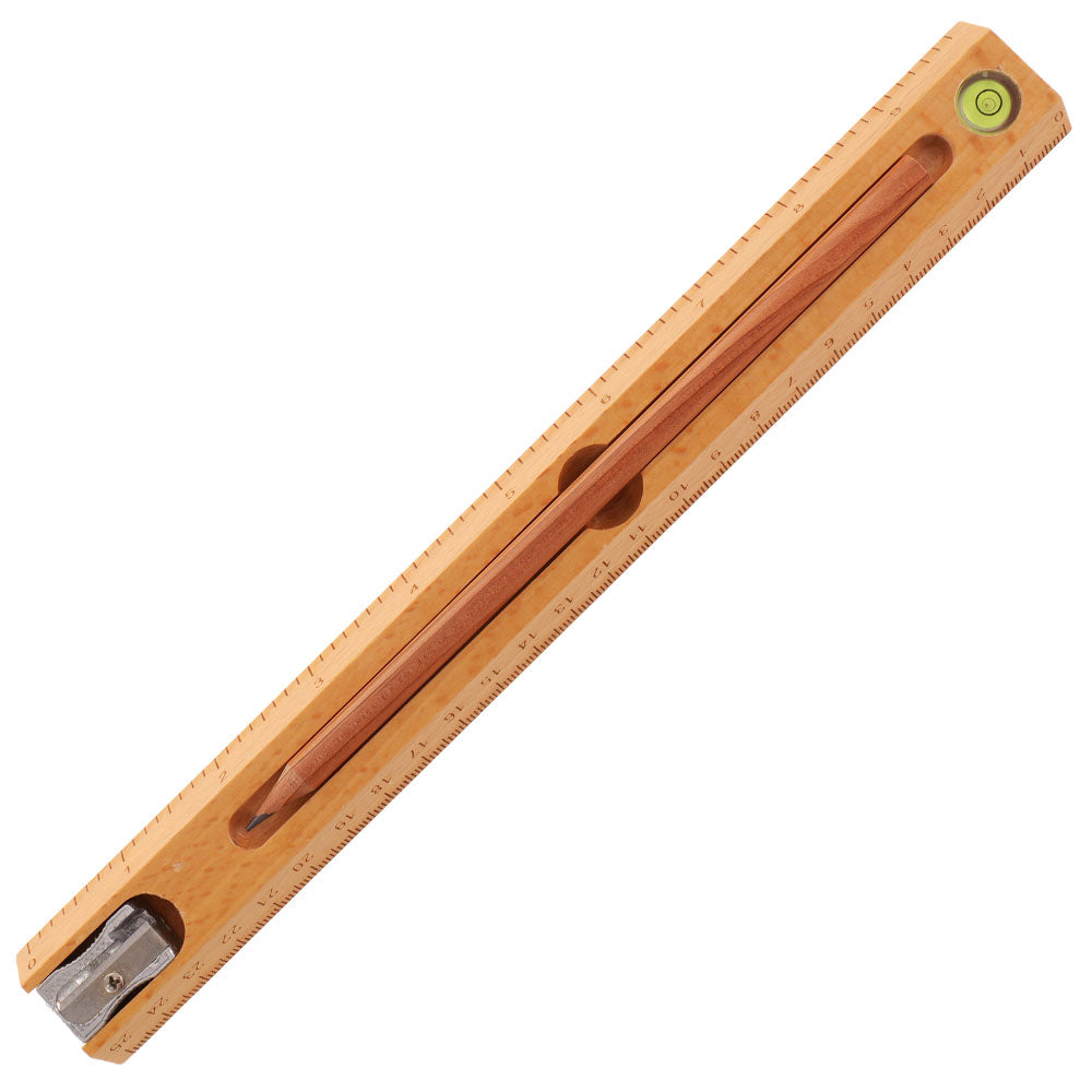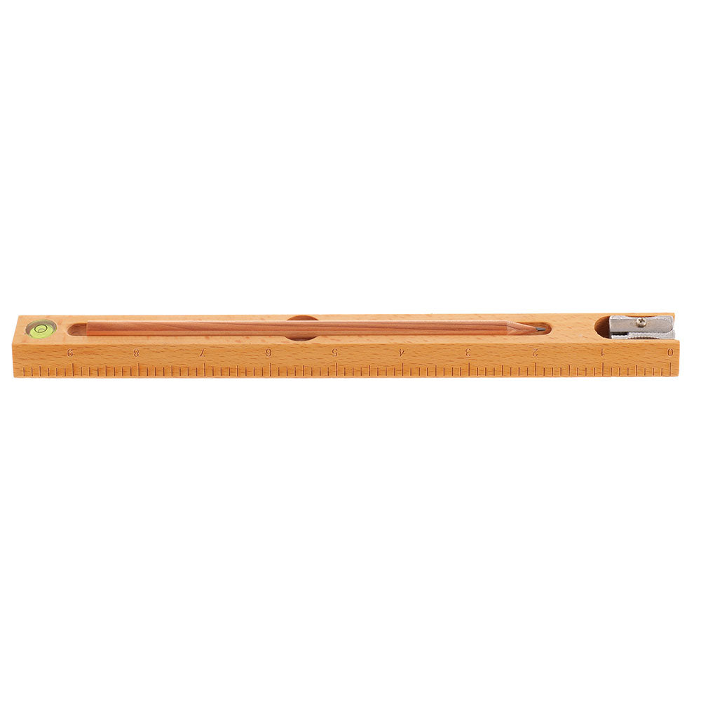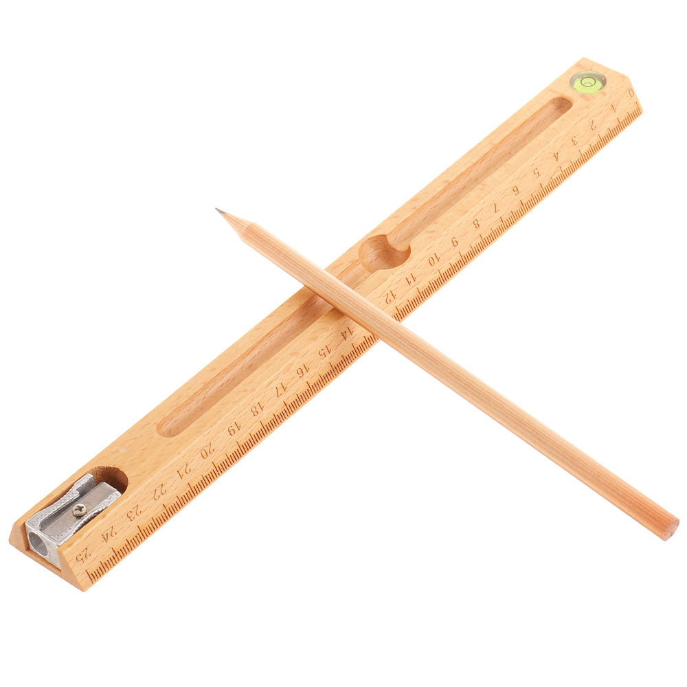 Set multifunctional din lemn care contine creion, ascutitoare, rigla si boloboc (bula de nivel)