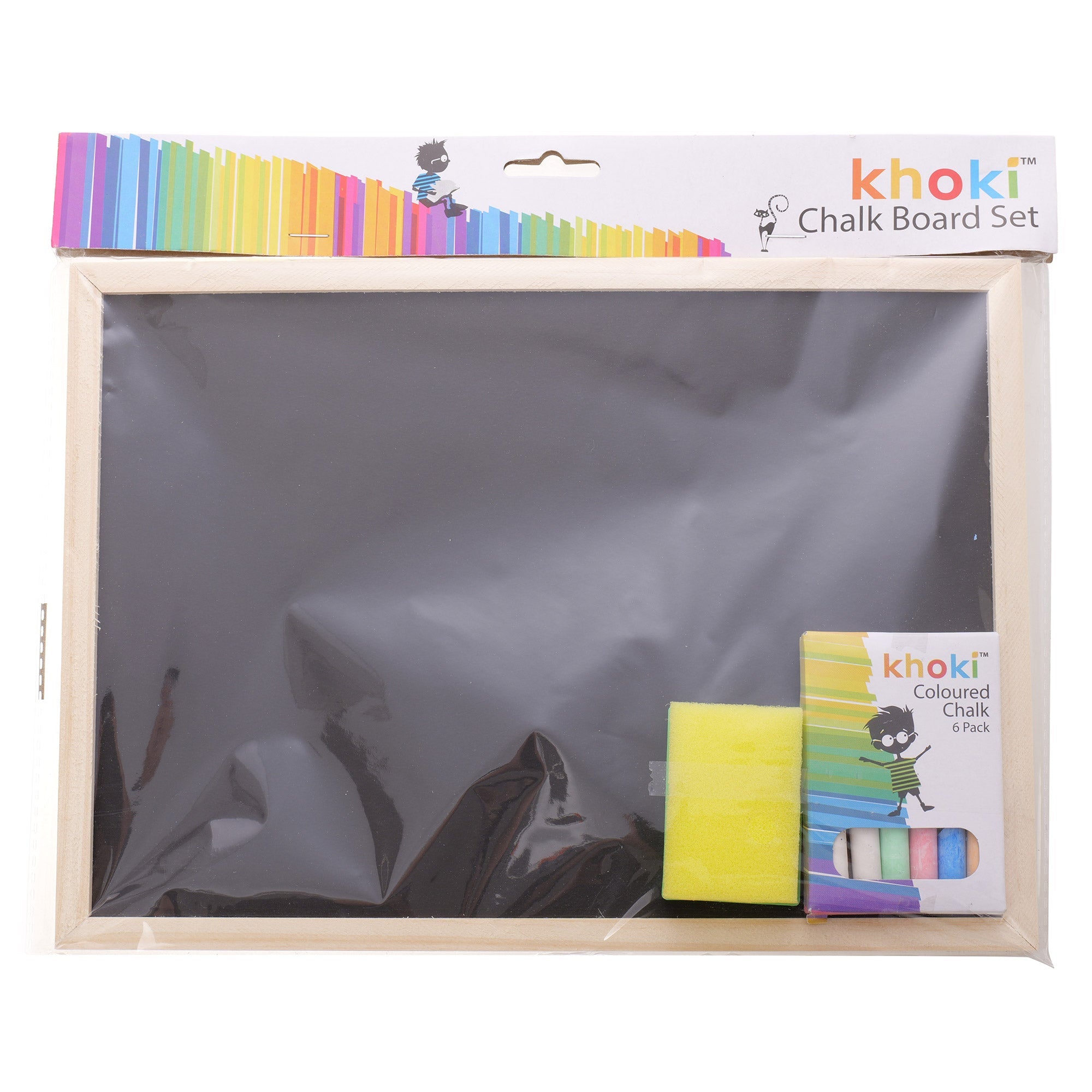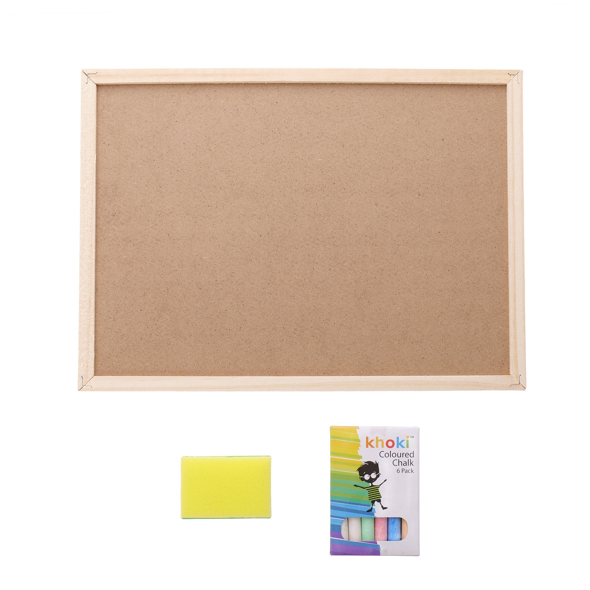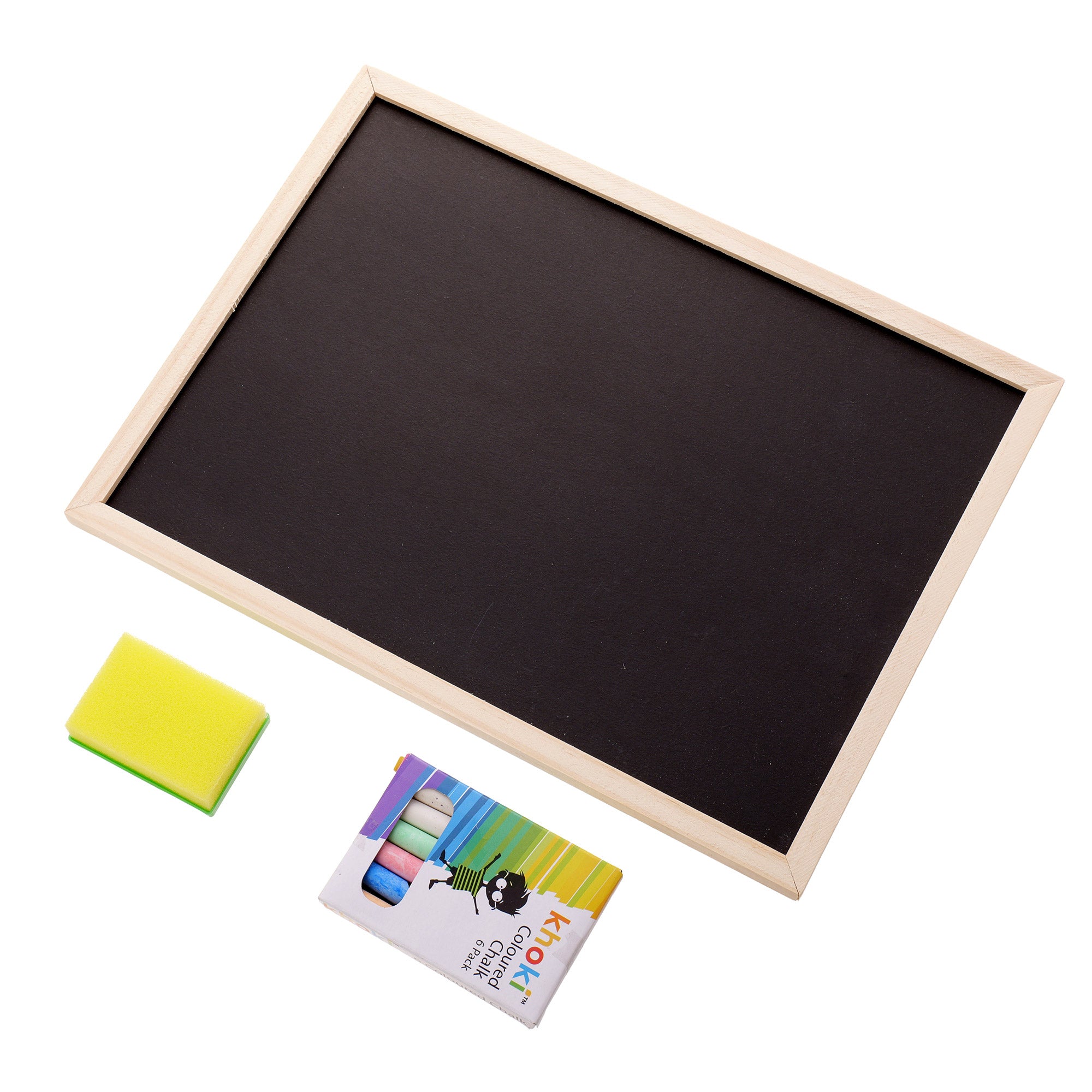 Tablă de desenat cu suprafață tip chalkboard, ideală pentru exerciții, jocuri sau activități educative. Este prevăzută cu ramă din lemn și vine împreună cu set de cretă colorată și burete pentru ștergere.