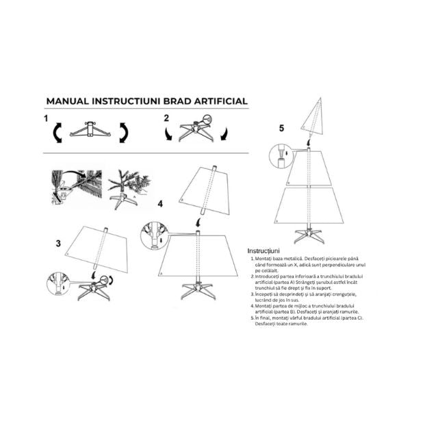 Montaj in sub un minut: bradul se pune în picioare în mai puțin de un minut datorită construcției pe articulații (hinged construction). Tot ce trebuie să faci după este să „ciufulești” ramurile strânse pentru a-i da forma finală, plină și stufoasă.