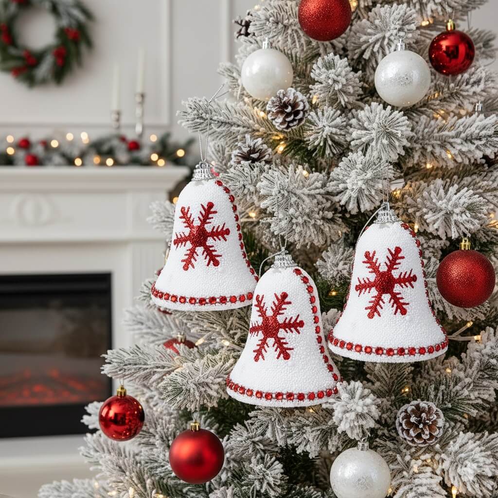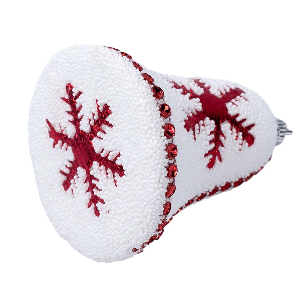 Evocați farmecul clasic al sărbătorilor cu acest clopoțel decorativ, o piesă centrală pentru un brad de Crăciun plin de eleganță. Textura sa unică, ce imită zăpada proaspăt așternută, și detaliile strălucitoare în roșu vibrant aduc căldură și o notă de rafinament decorului dumneavoastră.