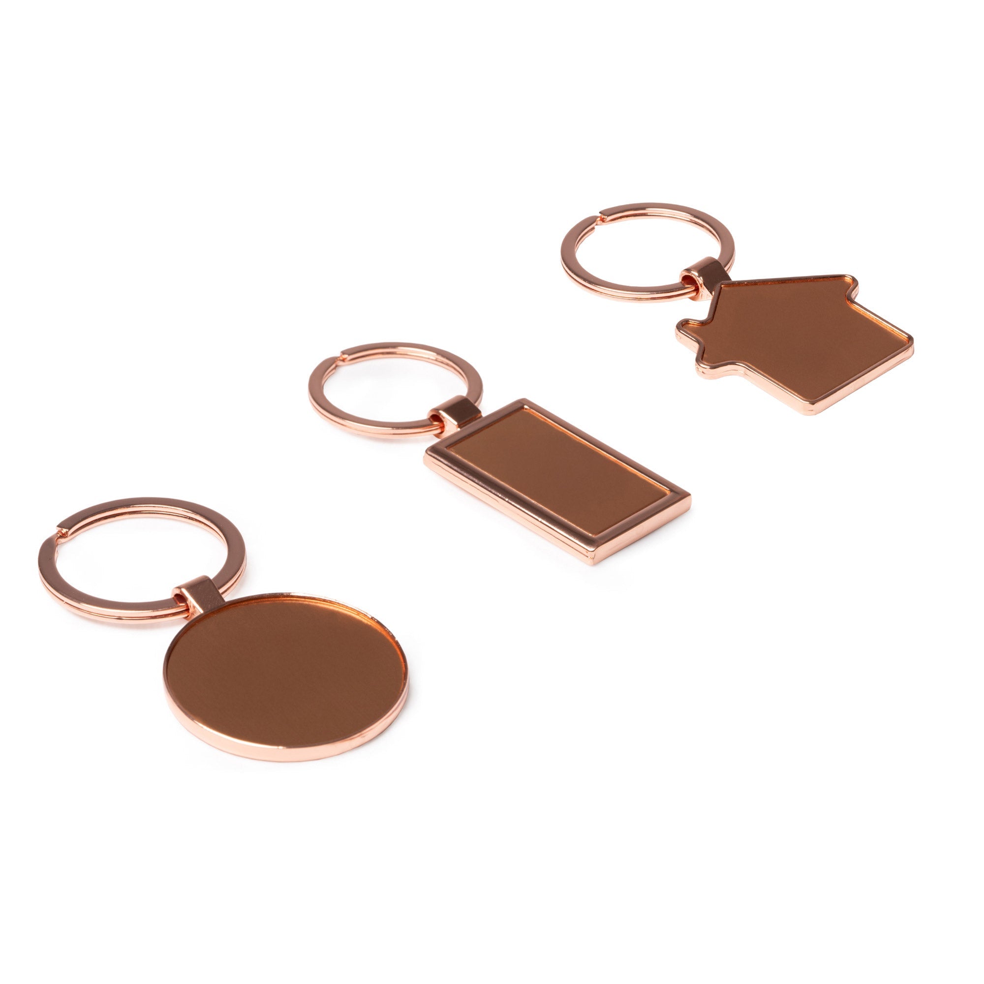 Breloc metalic din cupru, cu finisaj uniform și suprafață netedă, Construcția permite mai multe opțiuni de personalizare, fiind potrivit pentru cadouri, promoții sau utilizare zilnică.