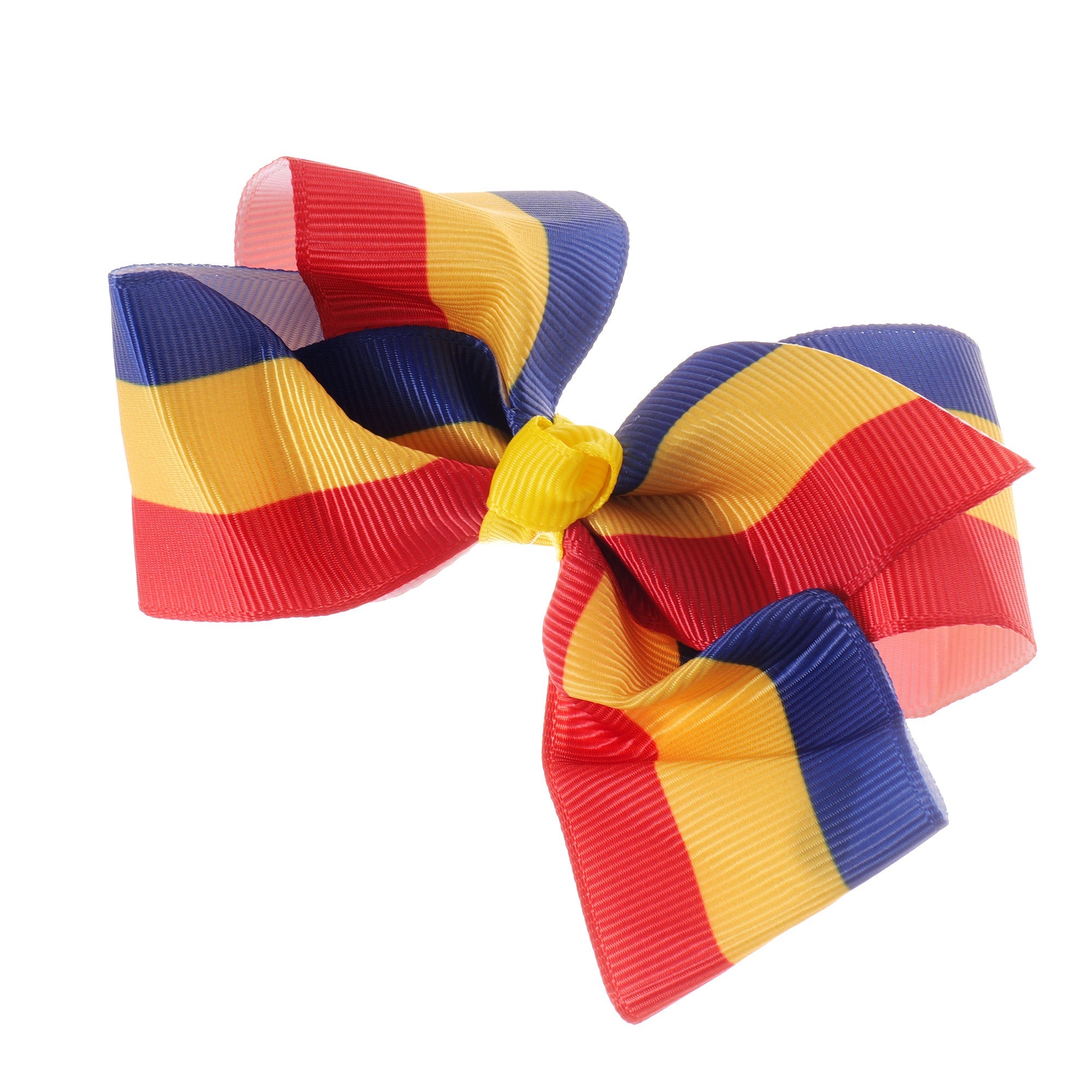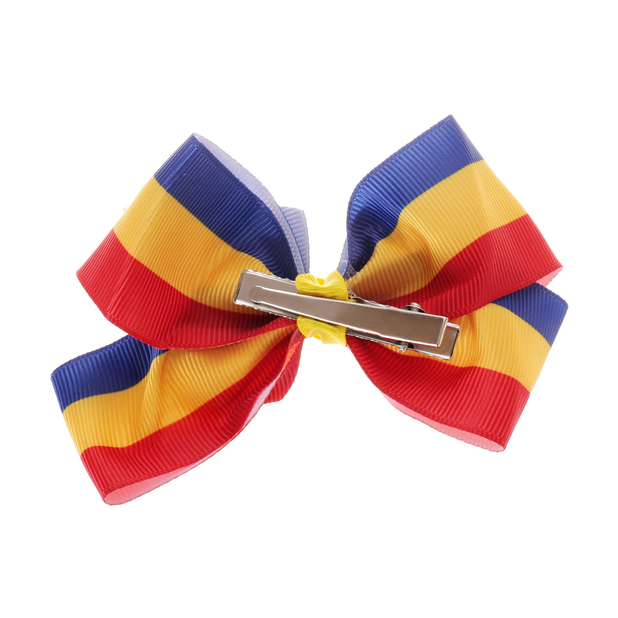 Papion textil realizat în culorile drapelului României – albastru, galben și roșu – perfect pentru a adăuga un plus de stil și patriotism la orice ținută.