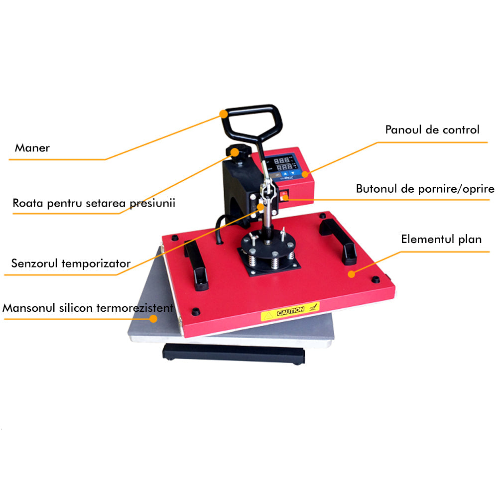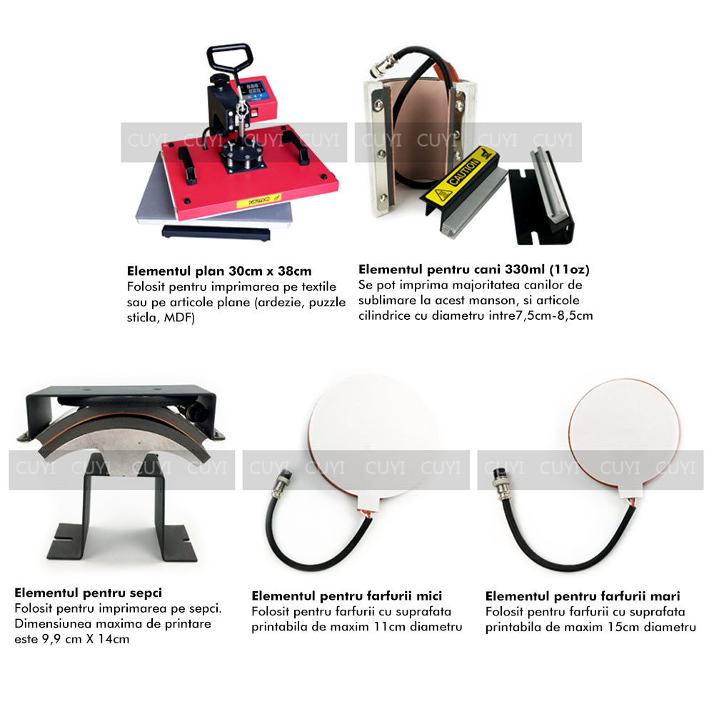 • Presa termica 5 in 1 este una dintre cele mai raspandite prese termice datorita functiilor multiple de imprimare pe diferite obiecte.