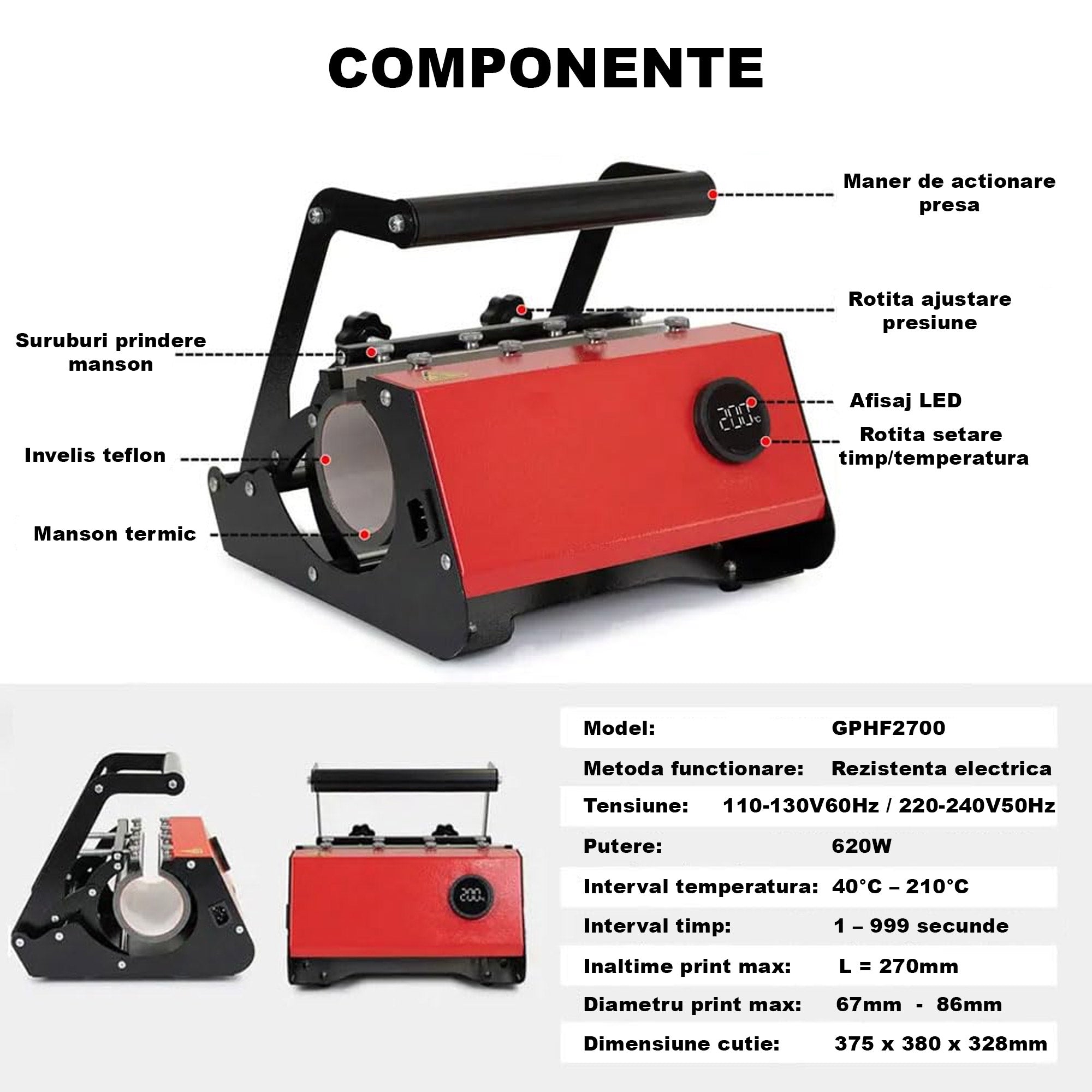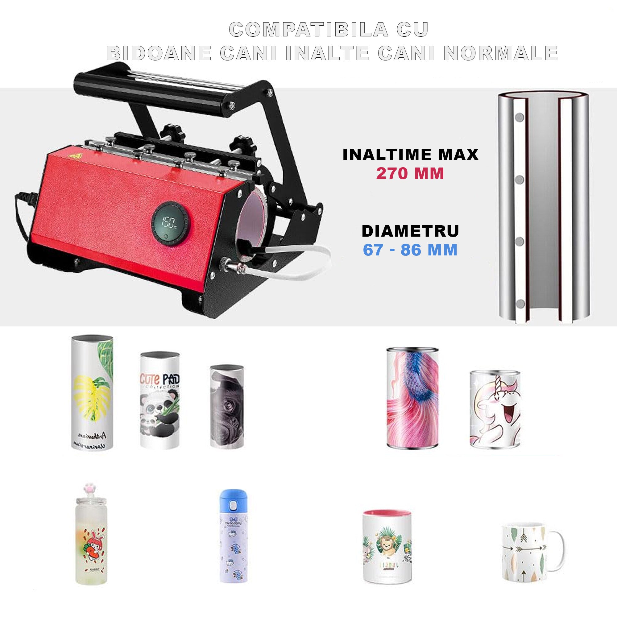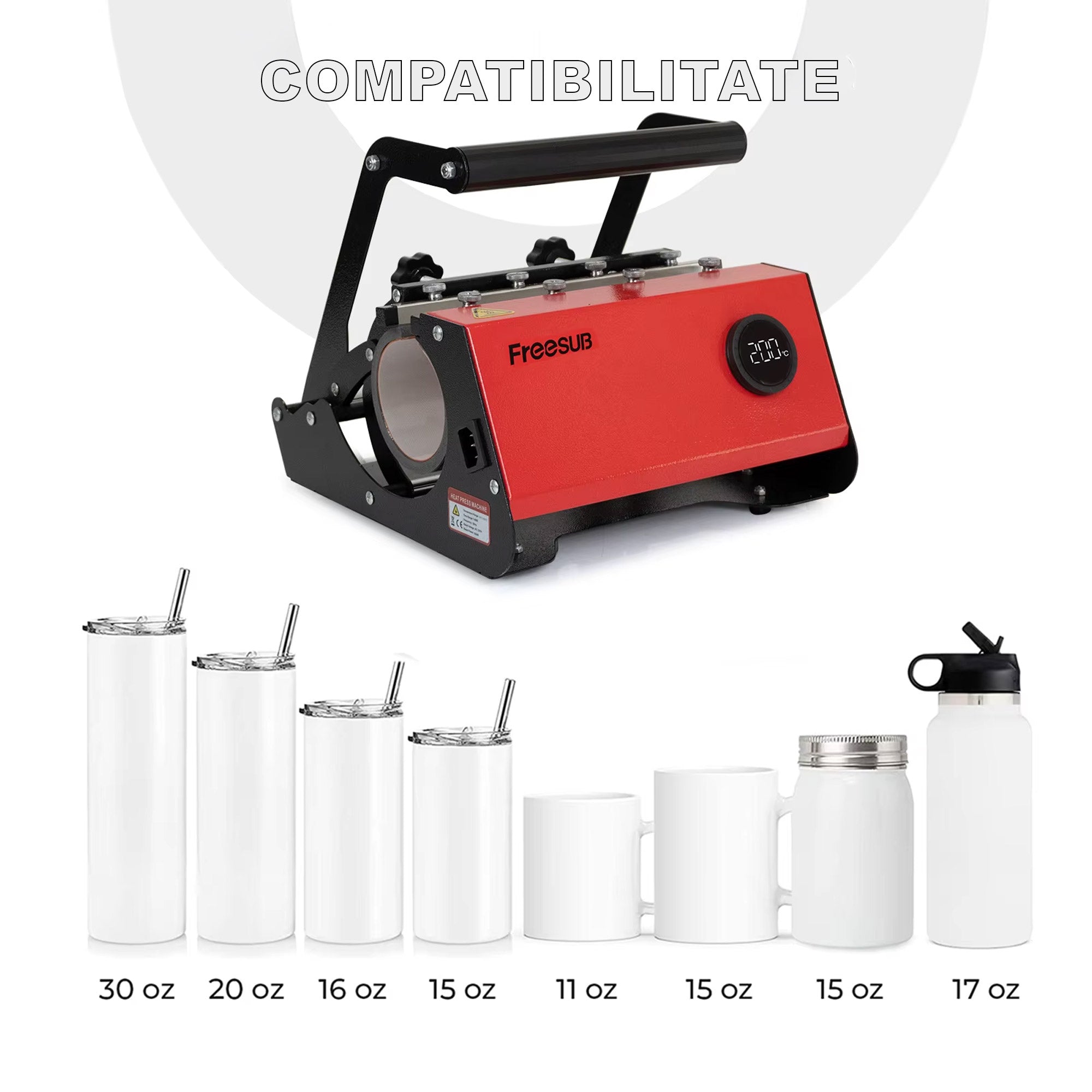 Presa termica Freesub este conceputa pentru personalizarea prin sublimare a bidoanelor, canilor si tumblerelor. Functioneaza cu control digital al temperaturii si timpului, iar elementul de incalzire este din silicon si metal, pentru transfer uniform.