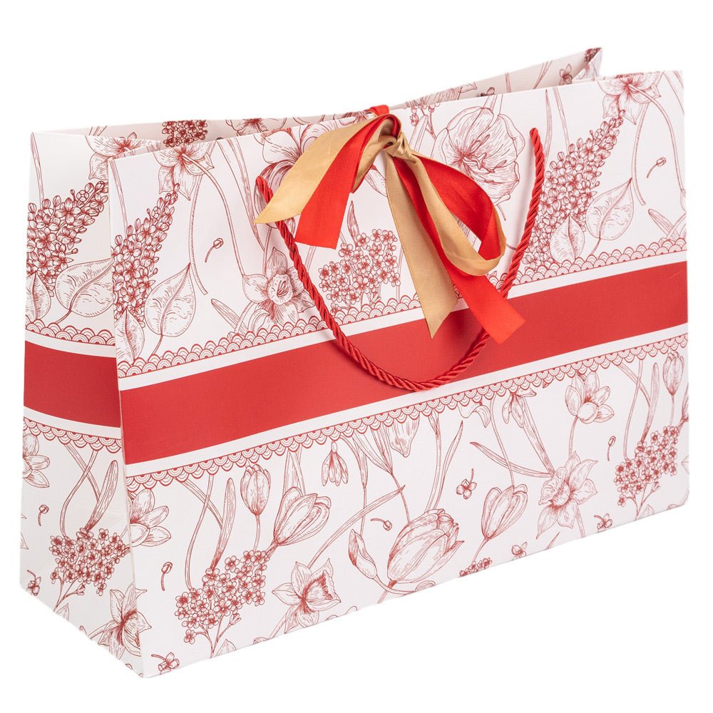 Pungă model floral cu 2 panglici colorate și mâner din sfoară - roșu (set 10 buc) 36x12x24cm