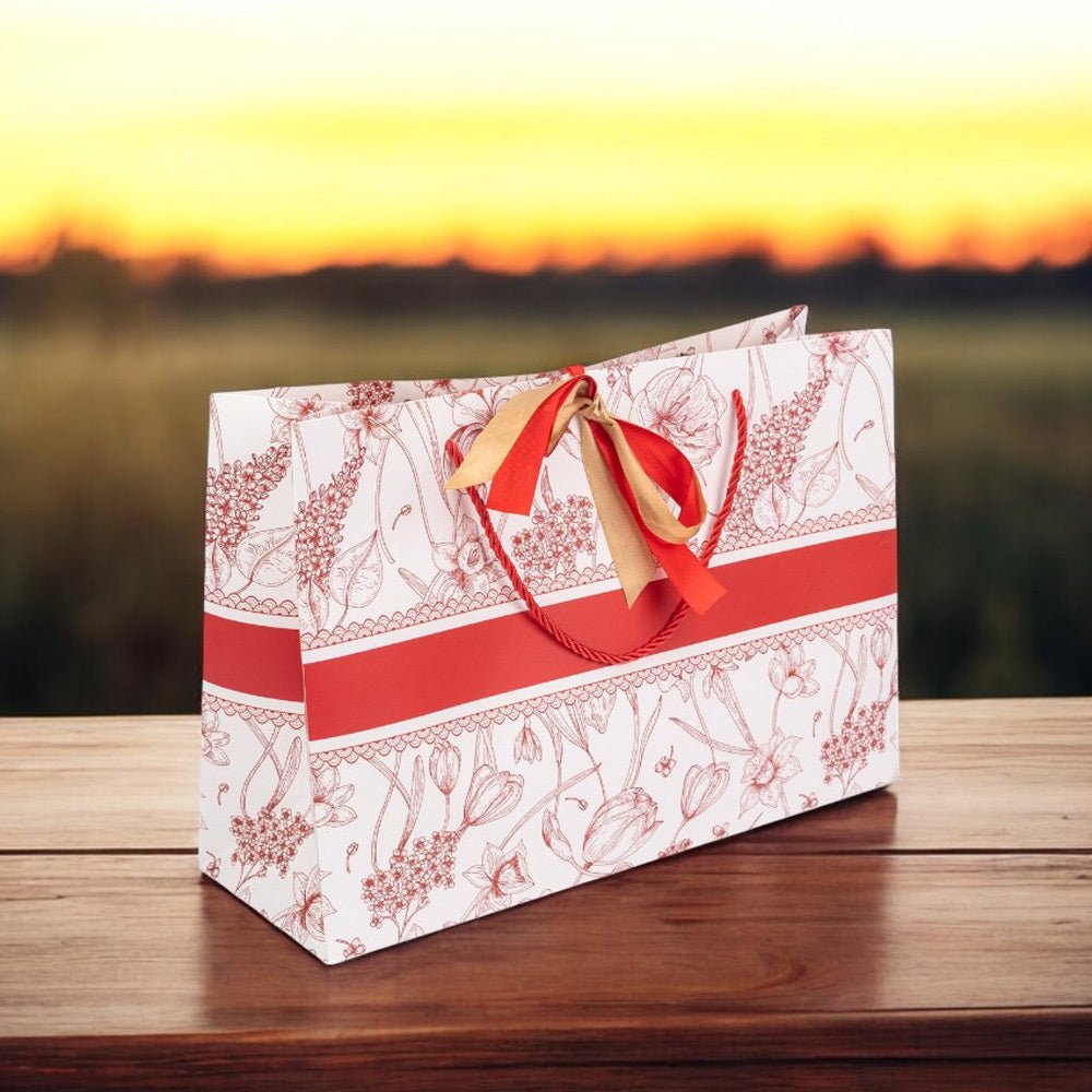 Pungă model floral cu 2 panglici colorate și mâner din sfoară - roșu, adaugă o notă de eleganță și rafinament cadourilor tale cu aceste pungi din hârtie de înaltă calitate, în culori puternice. Designul floral , cu accente roșii, le face perfecte pentru orice ocazie specială