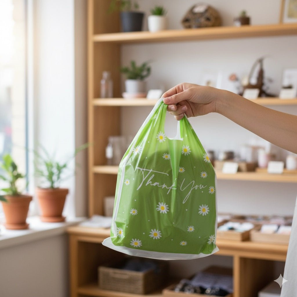 O pungă veselă și practică din plastic, cu un fundal verde proaspăt și un imprimeu adorabil de margarete, completat de mesajul "Thank You".