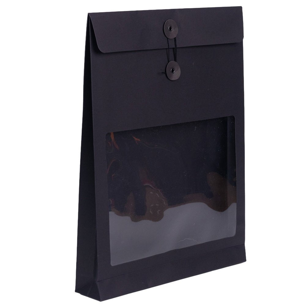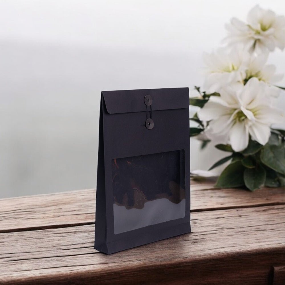 Pungă stand up cu fereastră și închidere cu sfoară - negru, aceste pungi elegante și practice din hârtie kraft sunt soluția ideală pentru ambalarea și prezentarea produselor tale într-un mod atractiv și ecologic.