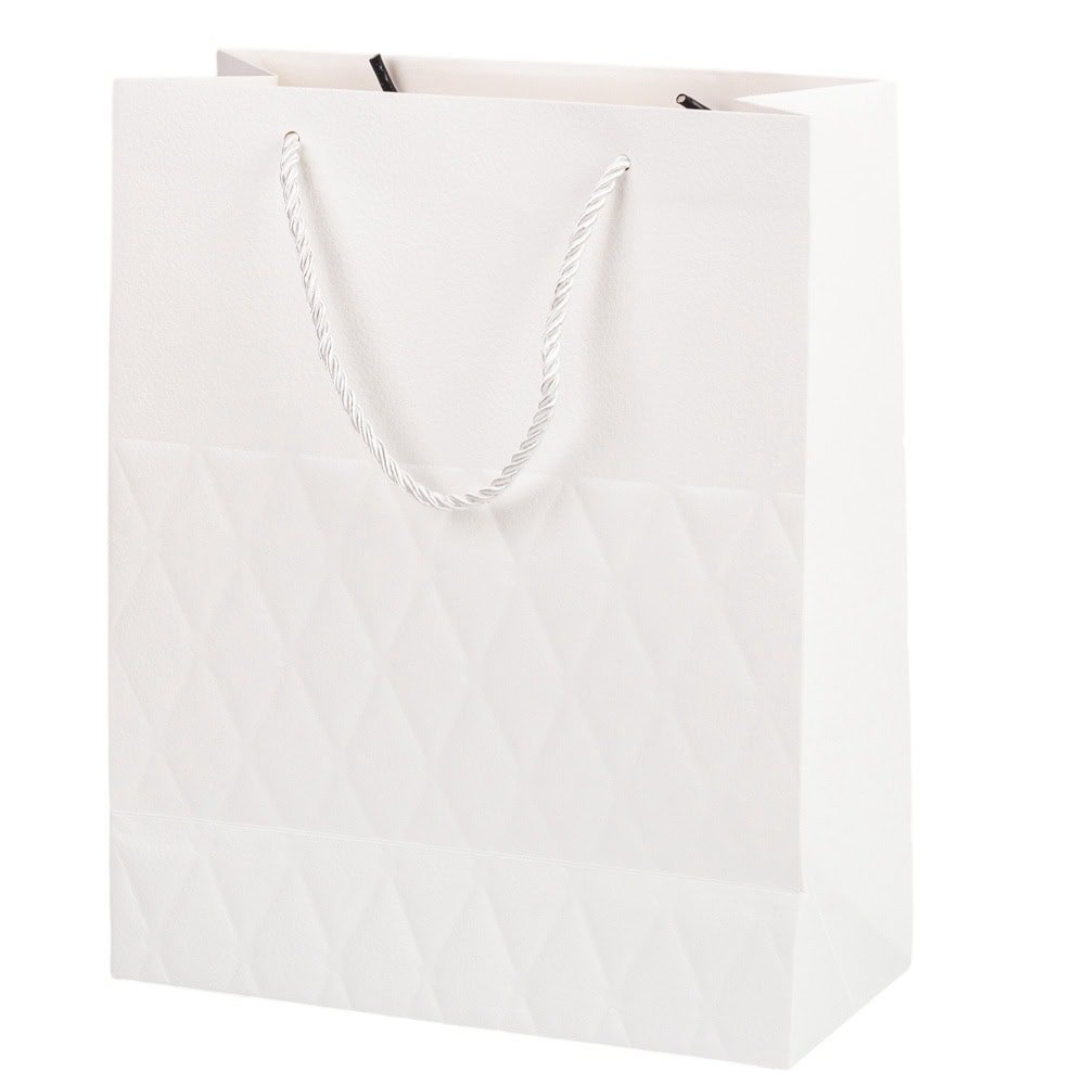 Pungi cadou cu mâner model fundă și romburi aurii 18x23x10cm - alb (set 12 buc)
