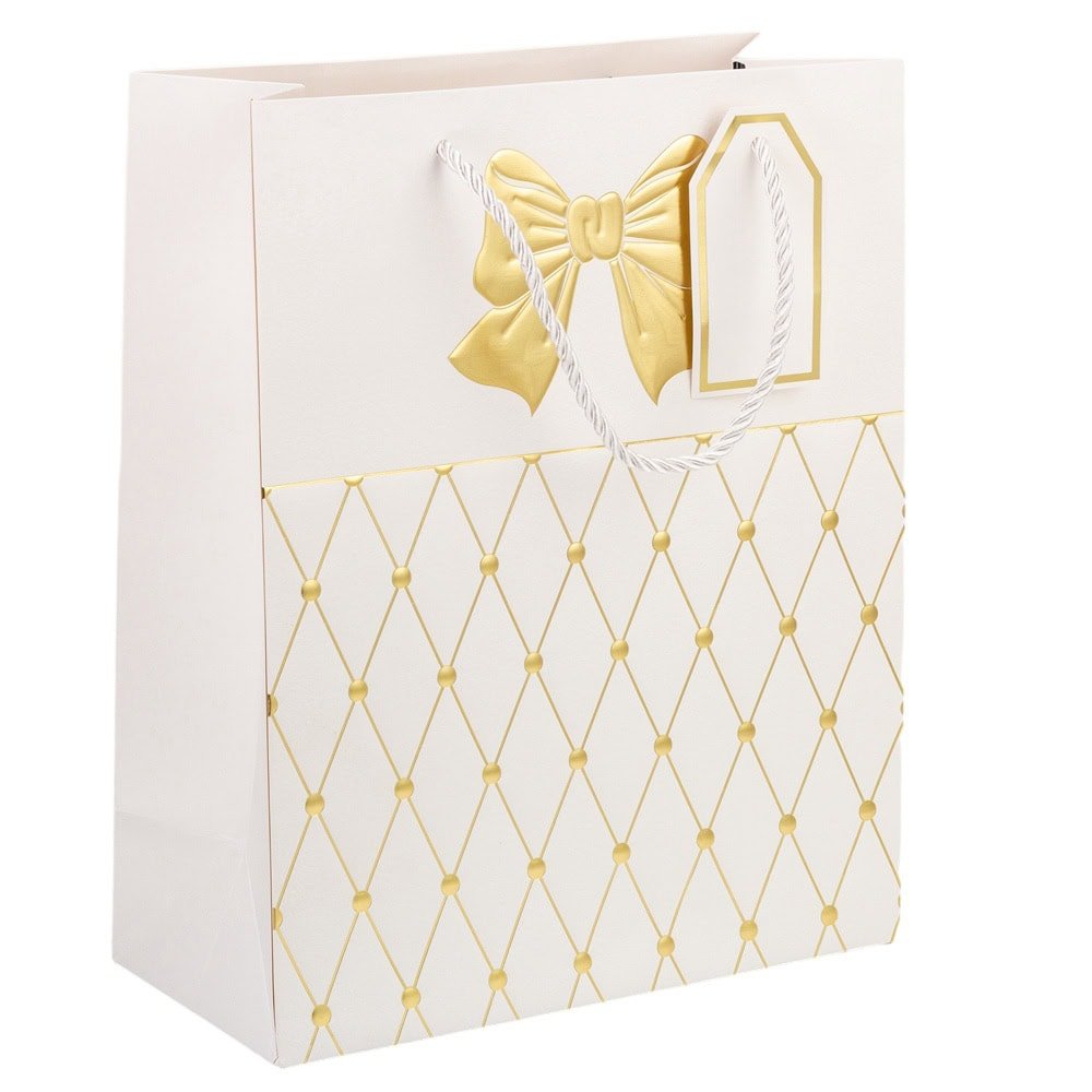 Pungi cadou cu mâner model fundă și romburi aurii 26x32x12cm - alb (set 12 buc)