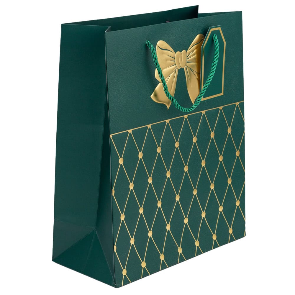 Pungi cadou cu mâner model fundă și romburi aurii 31x42x12cm - verde închis (set 12 buc)