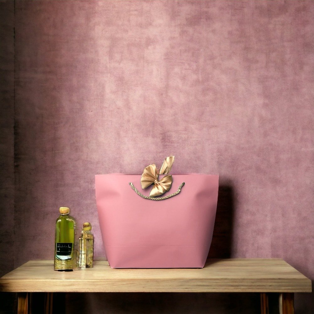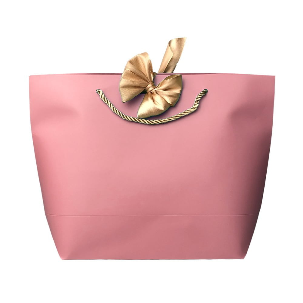 Pungi cadou cu mâner și fundă aurie - roz (set 12 buc) adaugă un touch elegant oricărui cadou, evidențiind atenția l