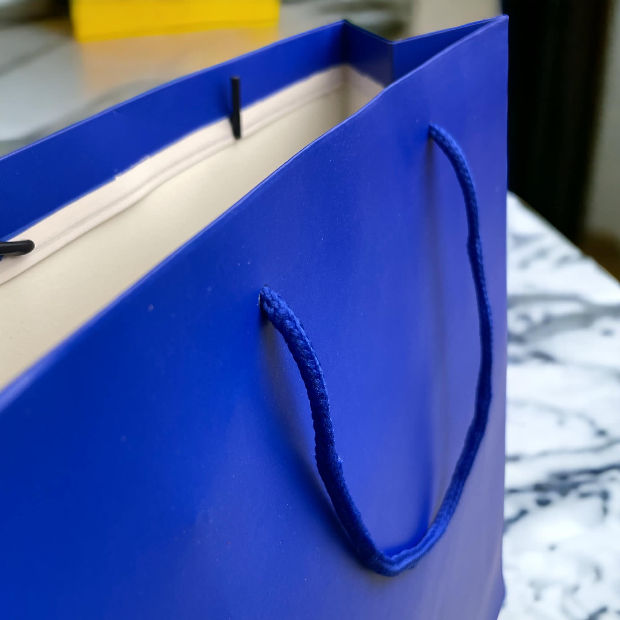 - Mânere Rezistente din Șnur Textil: Mânerele din șnur albastru închis sunt confortabile, rezistente și adaugă o notă de eleganță superioară mânerelor din hârtie, asigurând un transport sigur.