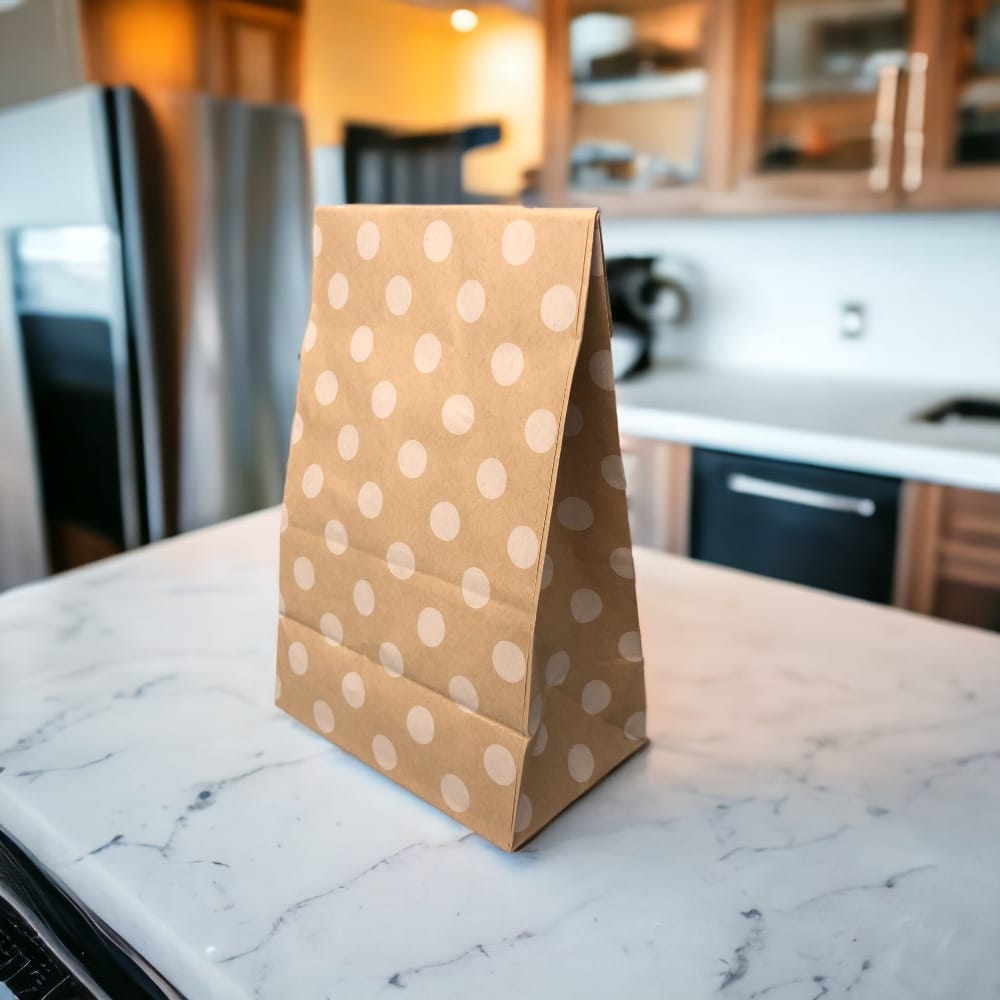 Pungi dreptunghiulare cu buline, sfoară, etichetă și sticker adaugă un stil jucaus și atrăgător ambalajului cadourilor tale!