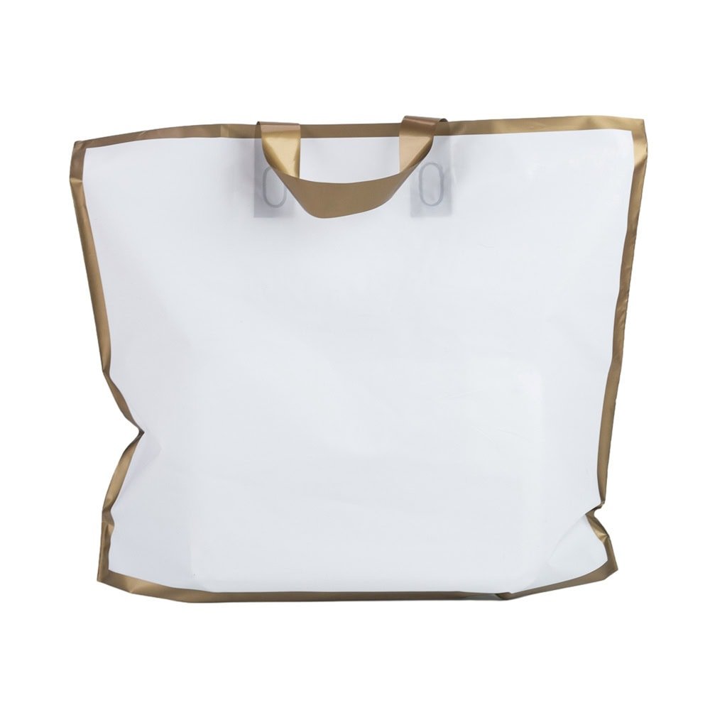 Pungi dreptunghiulare cu margini și mâner aurii - alb - Aceste pungi elegante și rezistente, în nuanțe de alb și auriu, aduc un plus de rafinament oricărui obiect pe care îl conțin. Combinația dintre culoarea roz și strălucirea auriului le face ideale pentru o gamă variată de utilizări.
