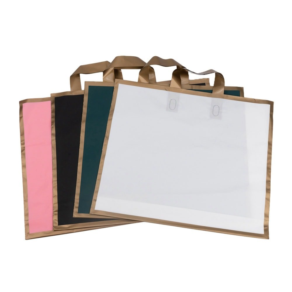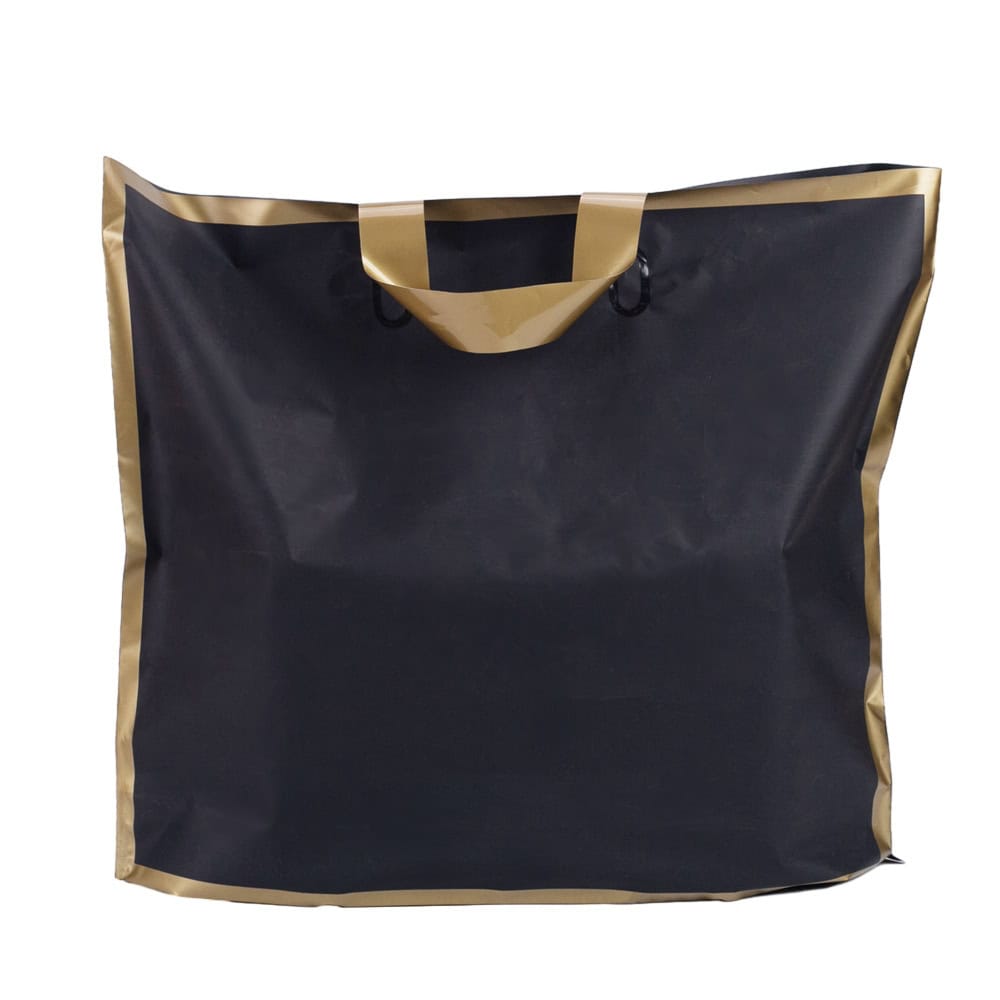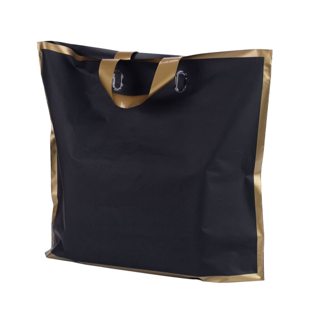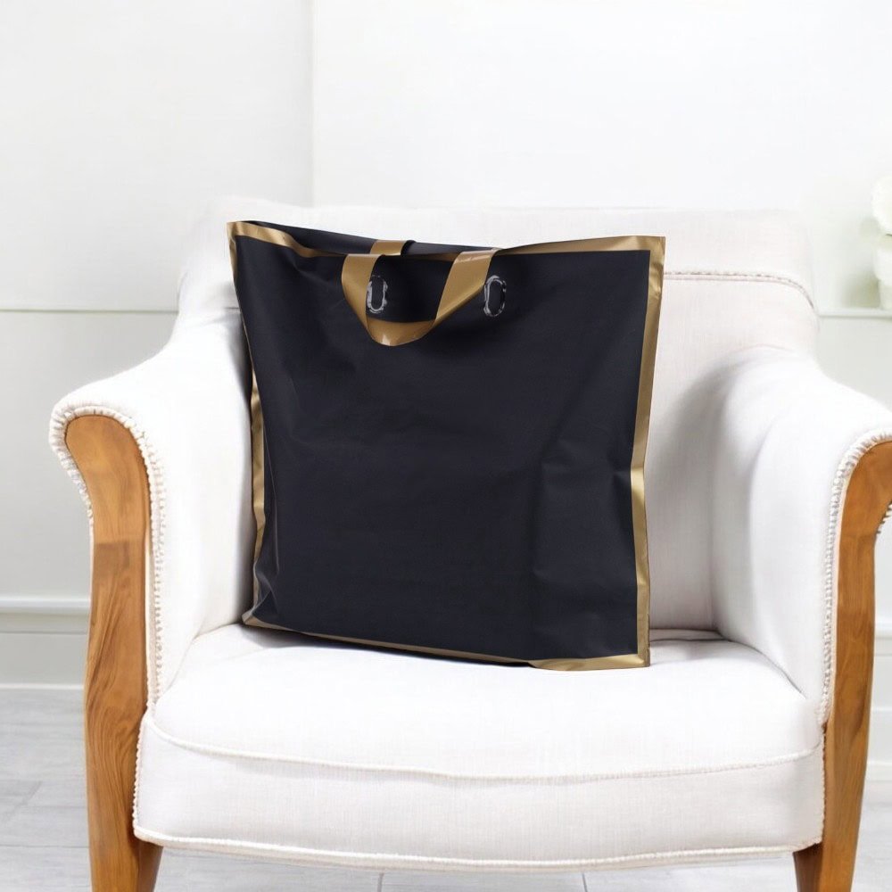 Pungi dreptunghiulare cu margini și mâner aurii - negru - Aceste pungi elegante și rezistente, în nuanțe de negru și auriu, aduc un plus de rafinament oricărui obiect pe care îl conțin. Combinația dintre culoarea roz și strălucirea auriului le face ideale pentru o gamă variată de utilizări.