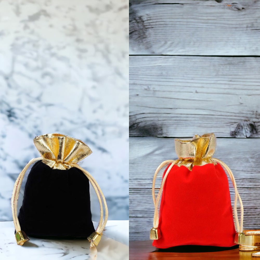 Săculeții noștri din catifea fină, accentuați de o margine aurie elegantă, sunt creați pentru a învălui bijuteriile, pietrele prețioase sau mărturiile de eveniment într-o aură de opulență și mister.