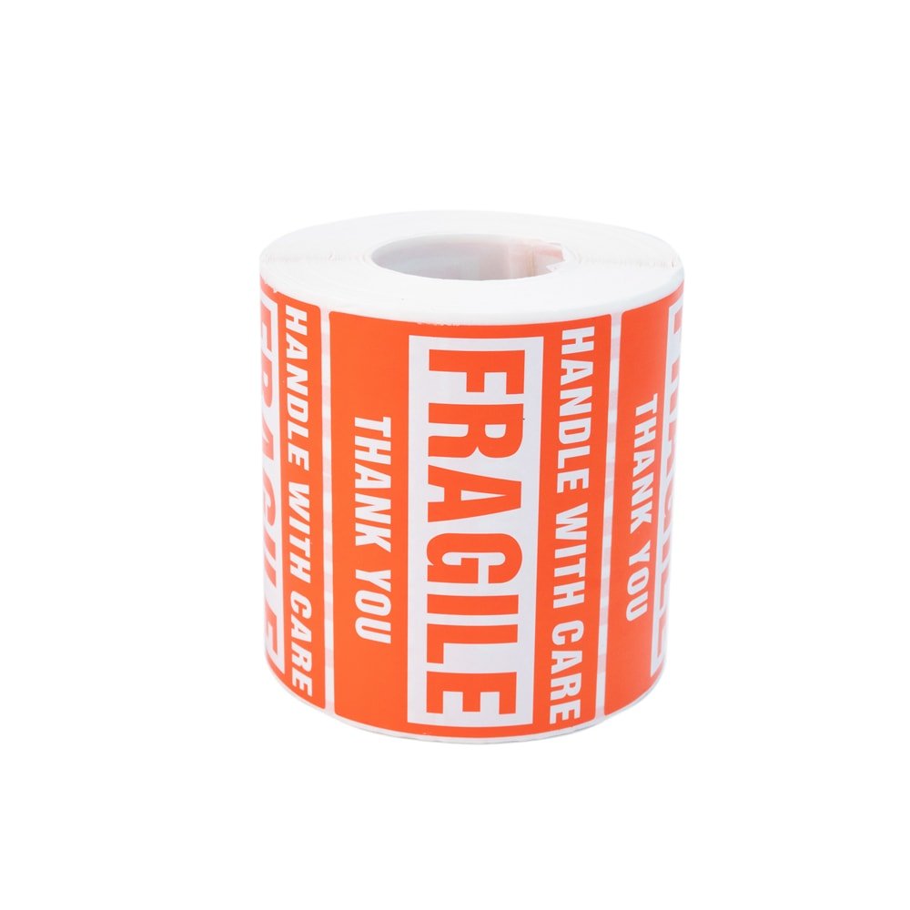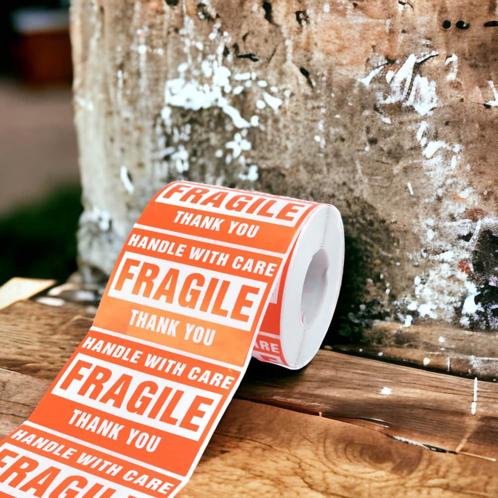 Rolă 500 stickere Fragile dreptunghiulare 5x7.5cm - model 2 (alb-rosu) perfecte pentru etichetarea și protejarea coletelor fragile.