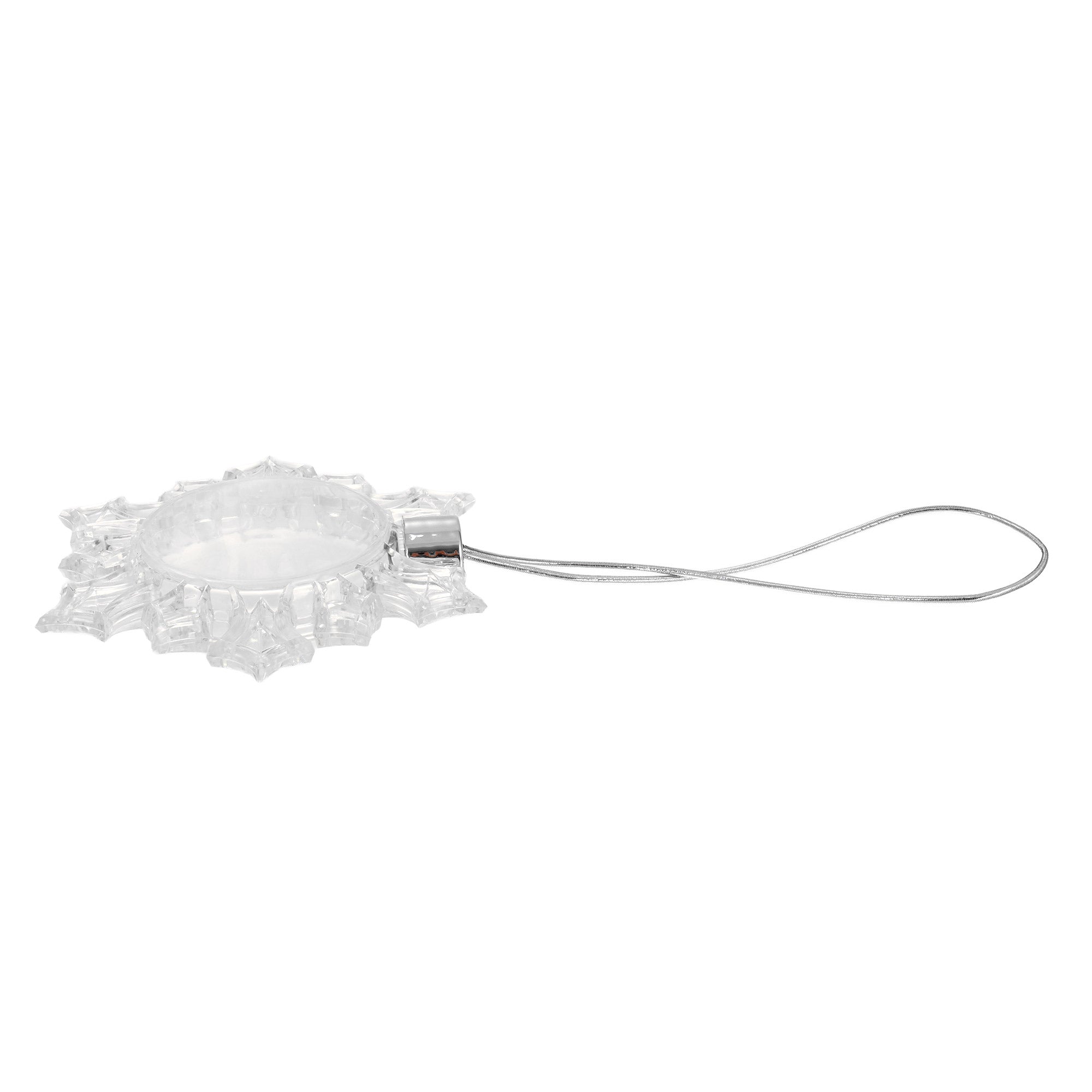 Ornament transparent pentru brad în formă de fulg de zăpadă, conceput pentru inserție foto sau personalizare prin sublimare. Globul este realizat din plastic transparent de calitate, cu reflexii clare, oferind un efect vizual plăcut în lumina bradului.