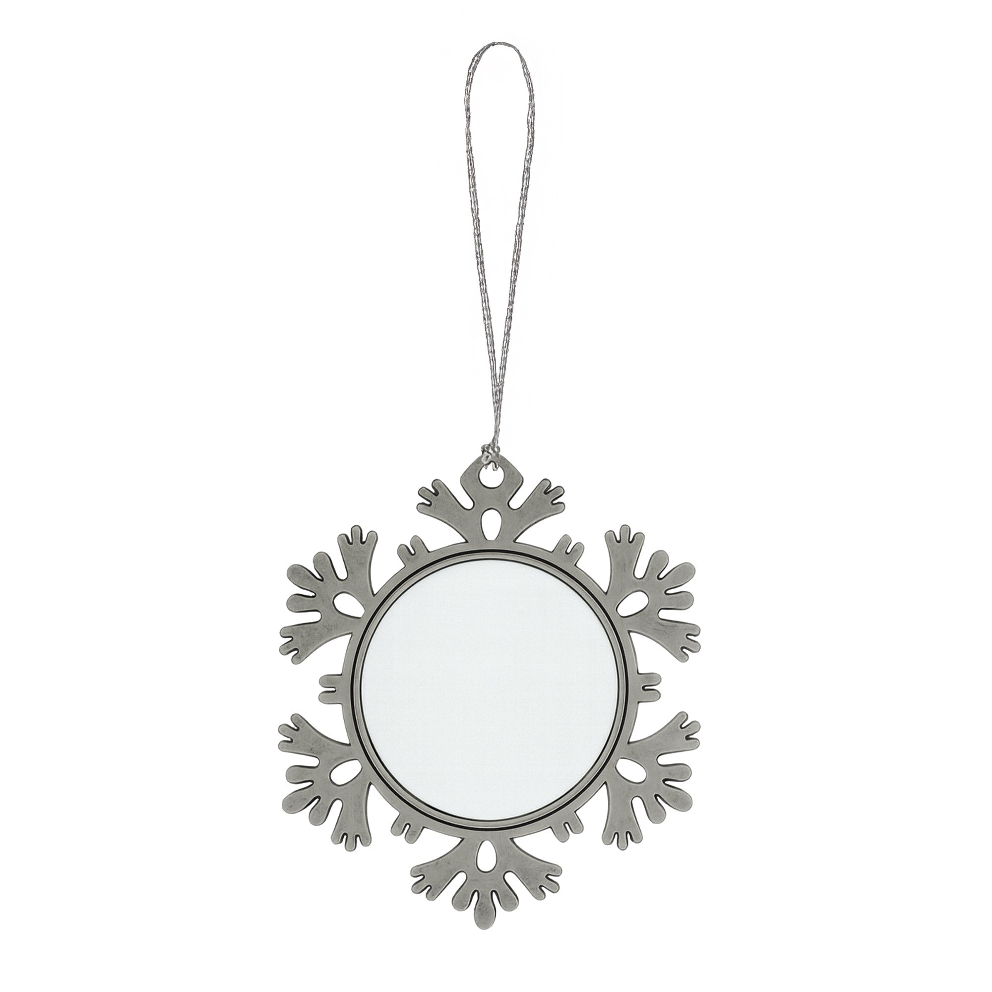 Ornament metalic pentru brad în formă de fulg de zăpadă, cu un design simetric și o suprafață sublimabilă perfectă pentru personalizare prin sublimare, gravura sau print UV.