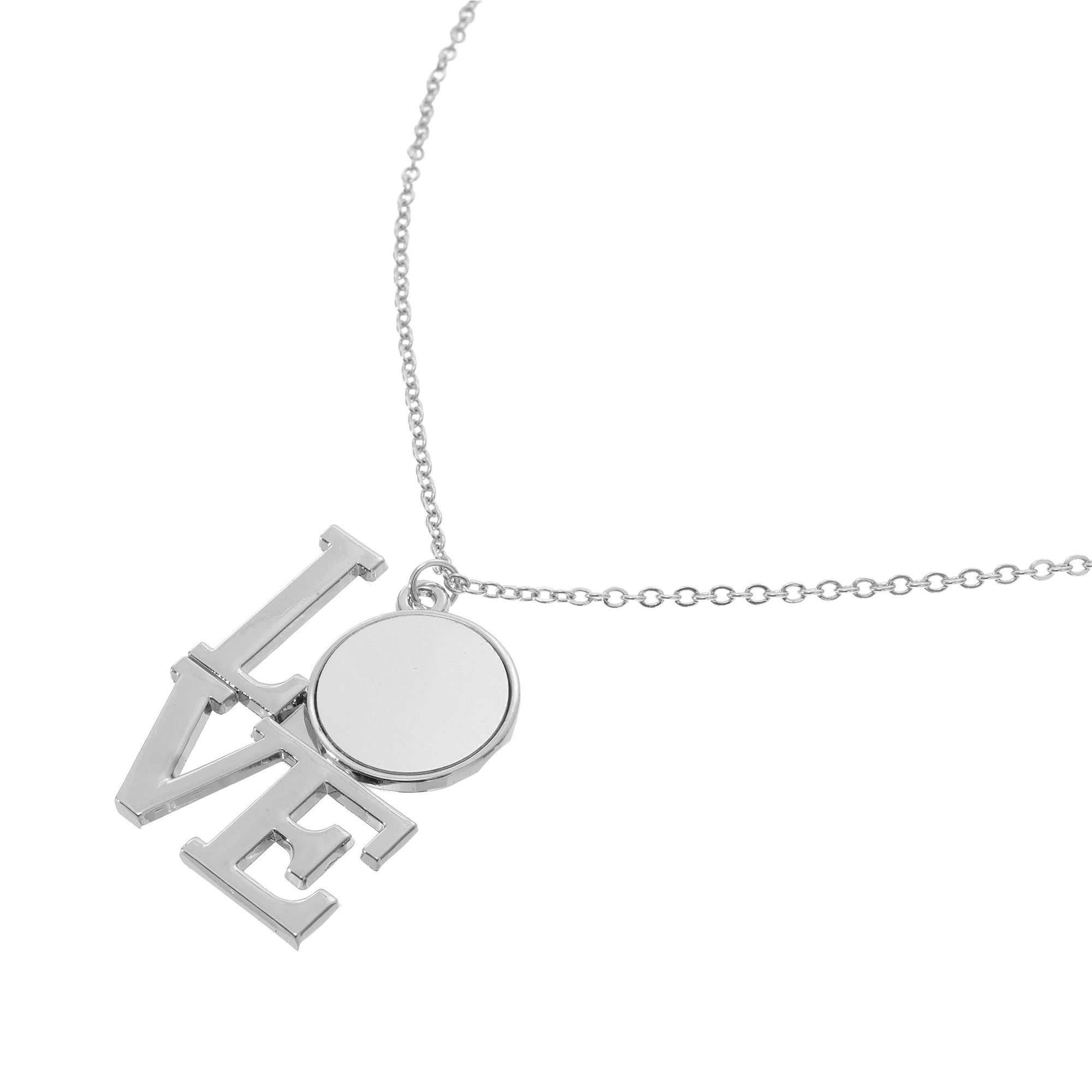 Colier metalic cu pandantiv decorativ în formă de inscripție LOVE, prevăzut cu o zonă rotundă destinată personalizării prin sublimare, gravura sau print UV. Designul permite adăugarea unei imagini, a unui simbol sau a unui text scurt.