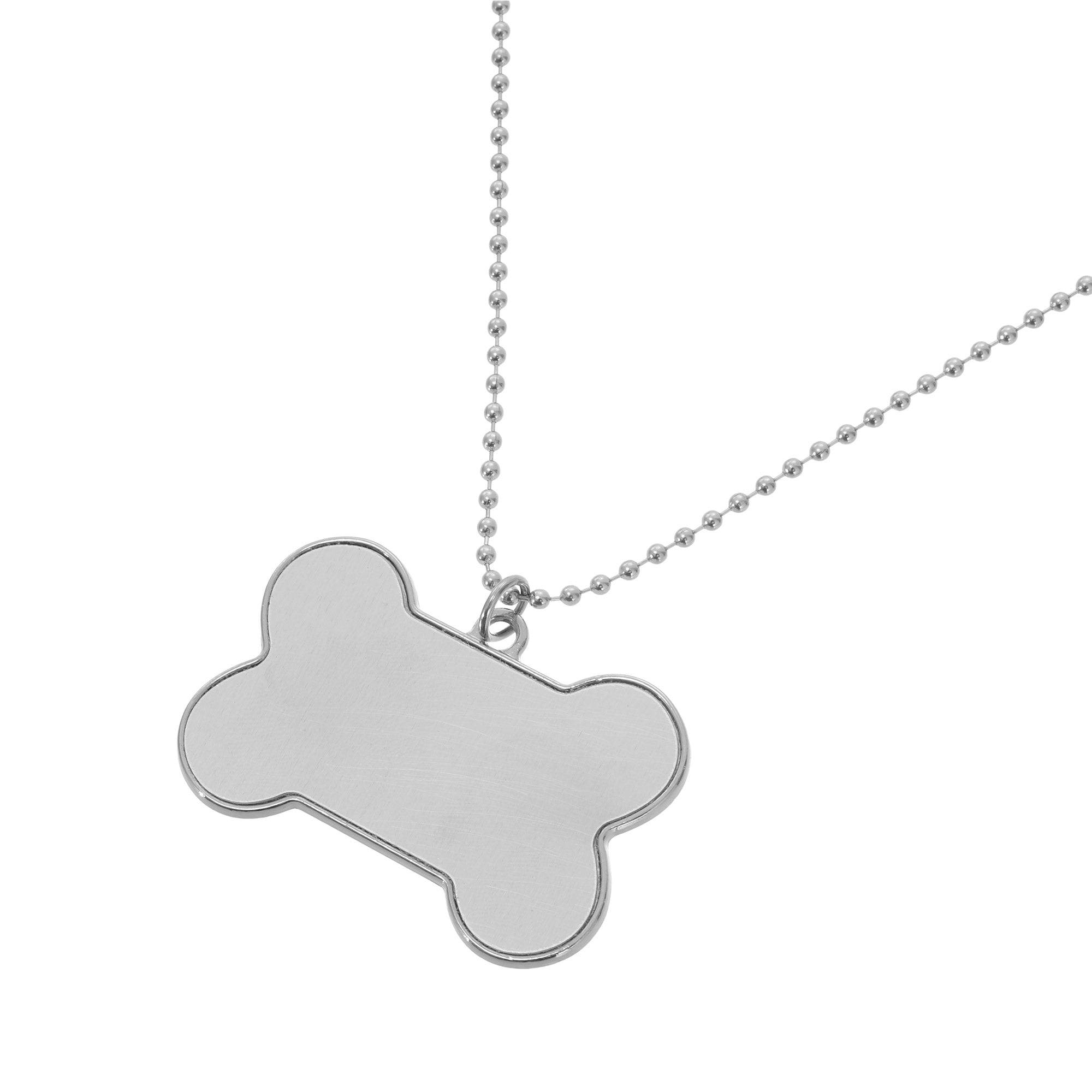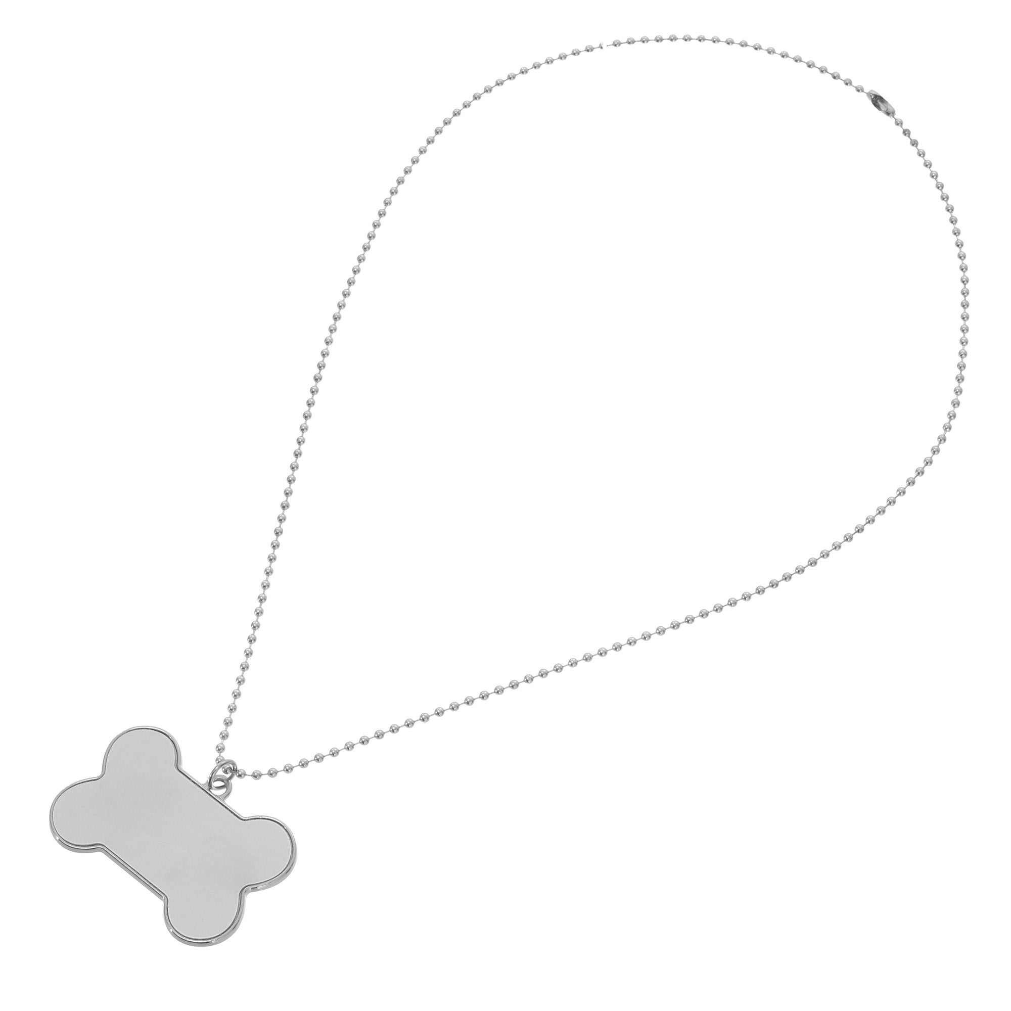 Colier metalic cu pandantiv în formă de os de cățeluș, realizat din oțel inoxidabil de calitate, destinat personalizării prin sublimare, gravura sau print UV. Suprafața lucioasă permite imprimarea clară a imaginilor, textelor sau logo-urilor.