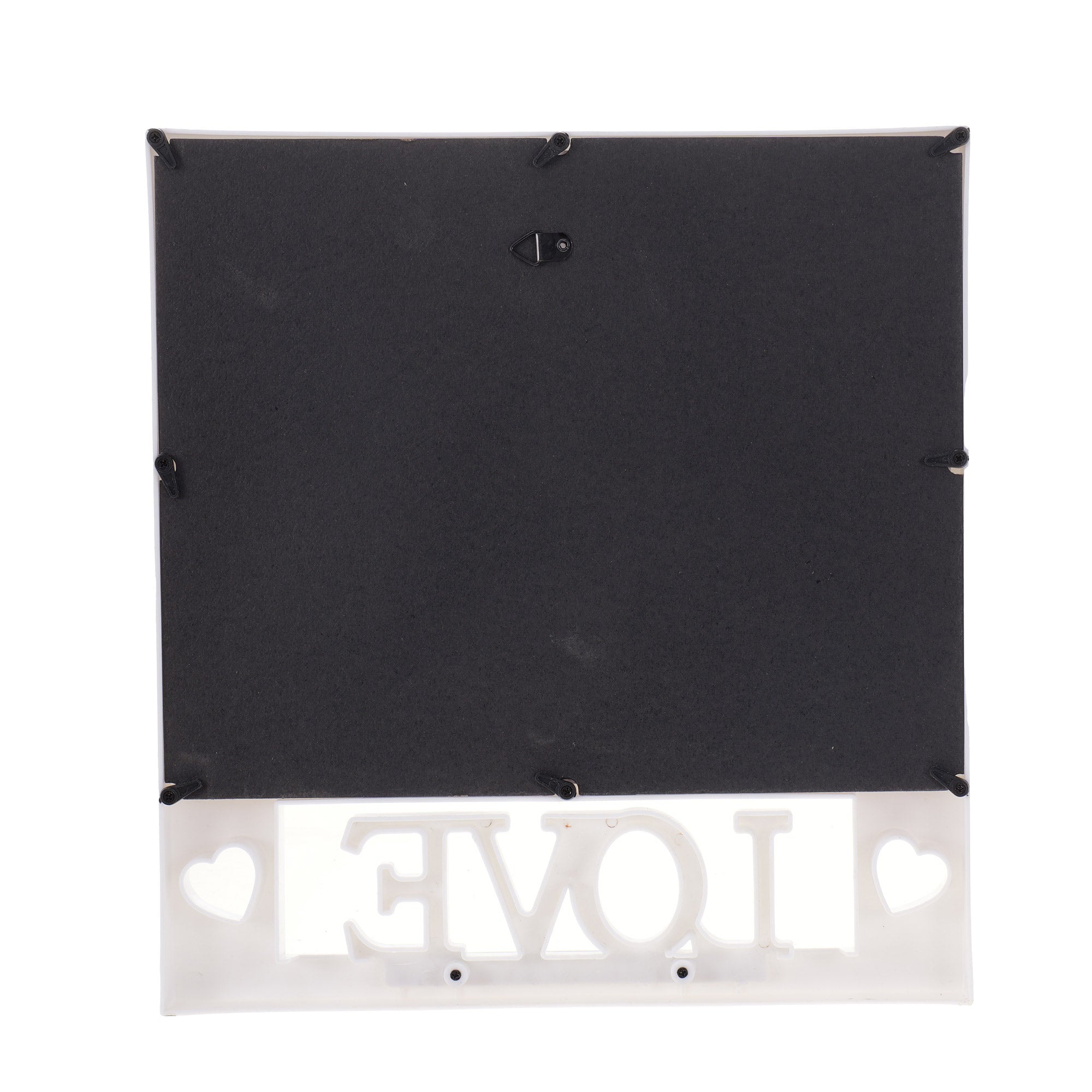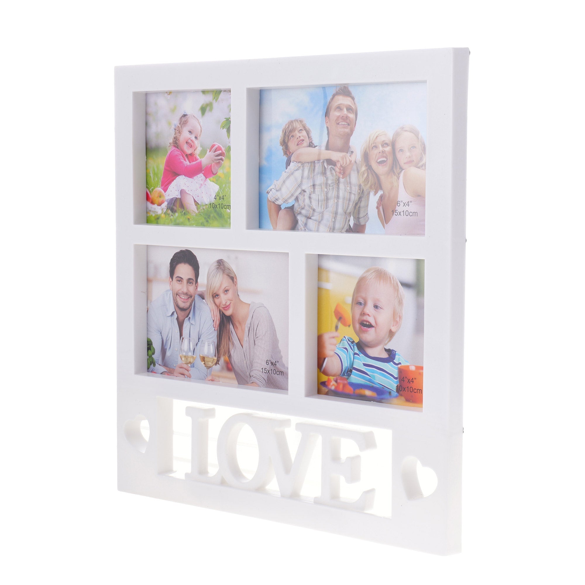 Rama foto colaj cu decoratiune "LOVE", ideala pentru a expune momente speciale in format multiplu. Design modern cu patru compartimente pentru poze si un finisaj alb, perfect pentru atarnarea pe perete. Fabricata din plastic rezistent prin injectie pe matrita, permite forme complexe si un aspect curat.
