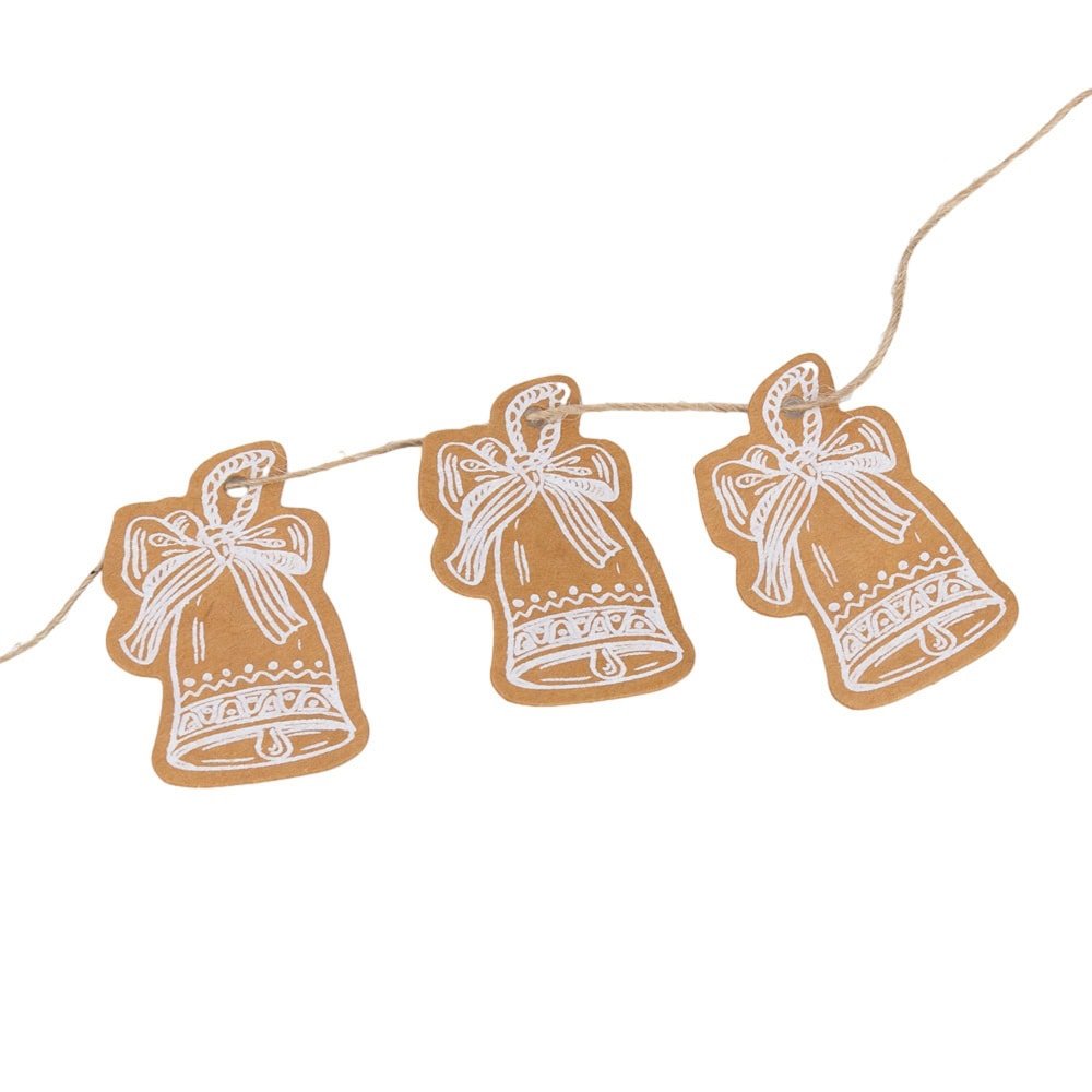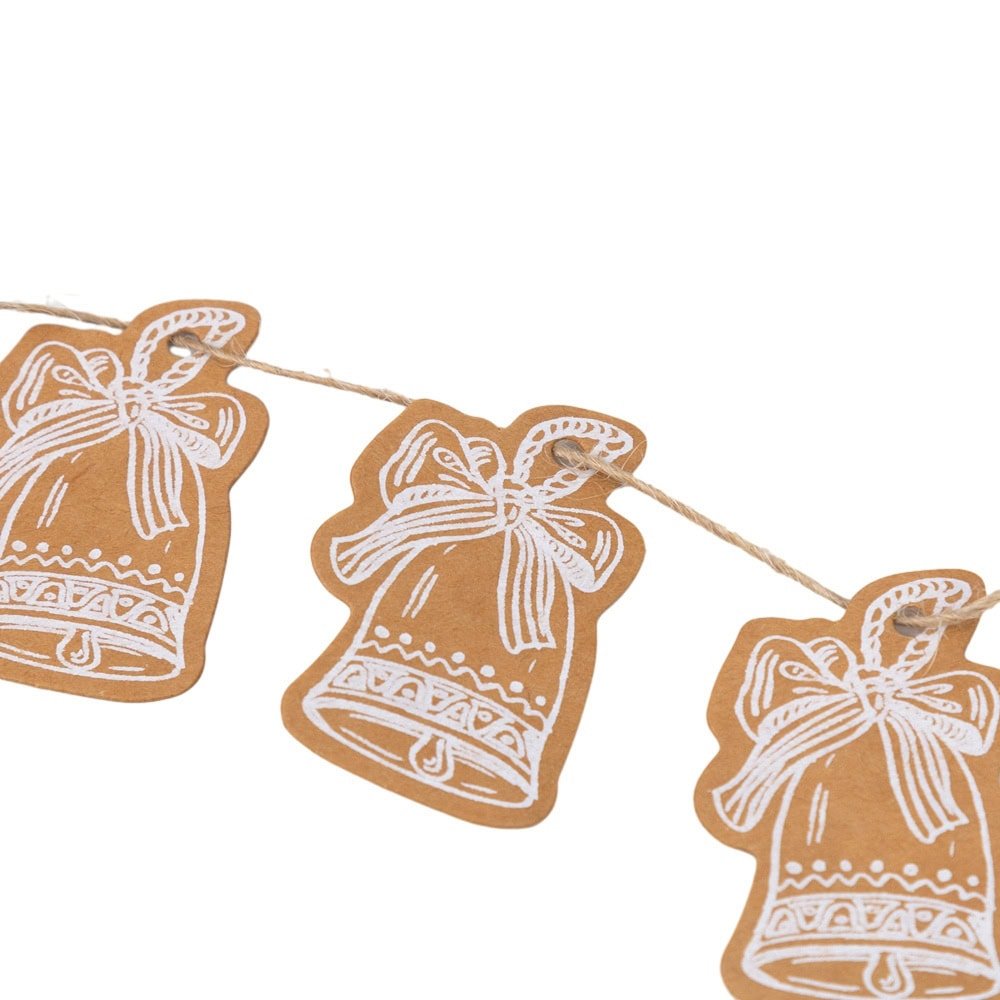 Christmas bell shaped tags with string - kraft help you add a rustic and elegant touch to your Christmas gifts. The set includes both the tags and a natural jute string, perfect for attaching them to packages. The simple and elegant design, with traditional Christmas motifs, fits any packaging style.