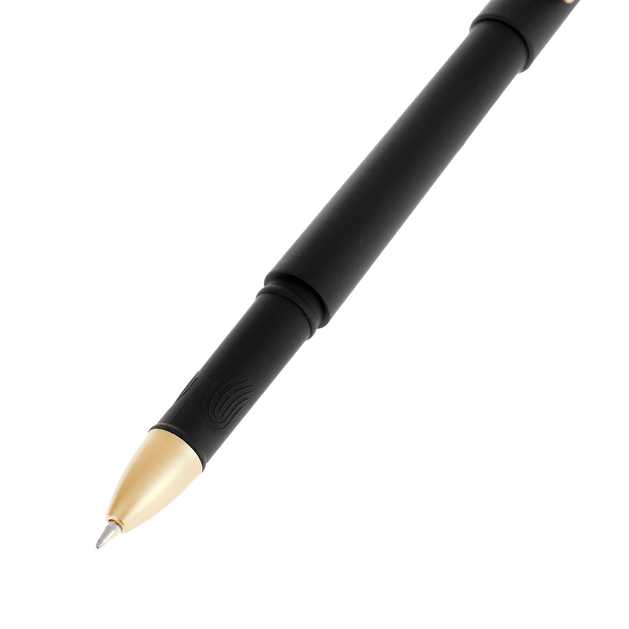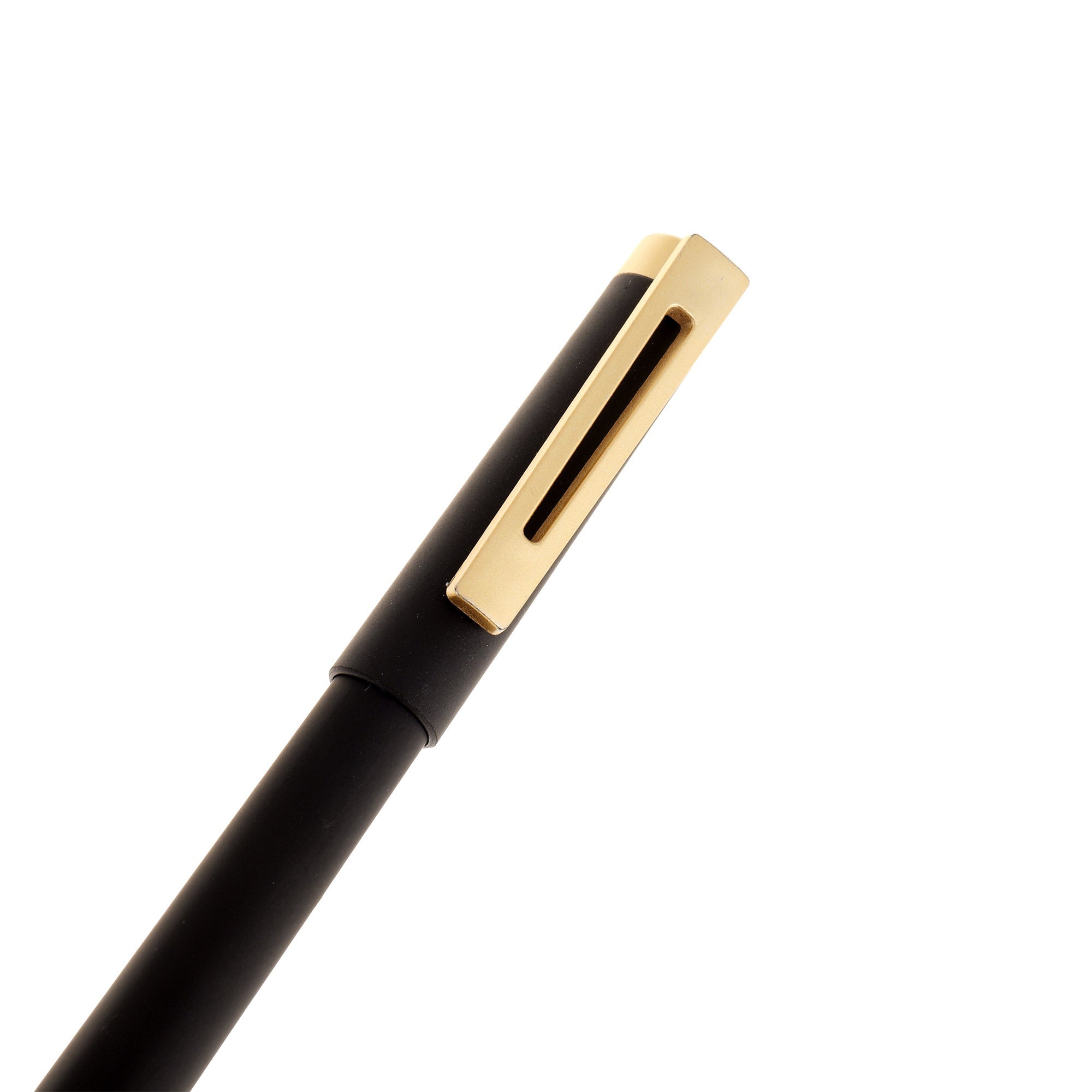 Pen with a contrasting matte black cap and gold accents, conveying understated elegance and modern style. The wide, linear clip accentuates the contemporary look. Suitable for everyday use or as personalized promotional material.