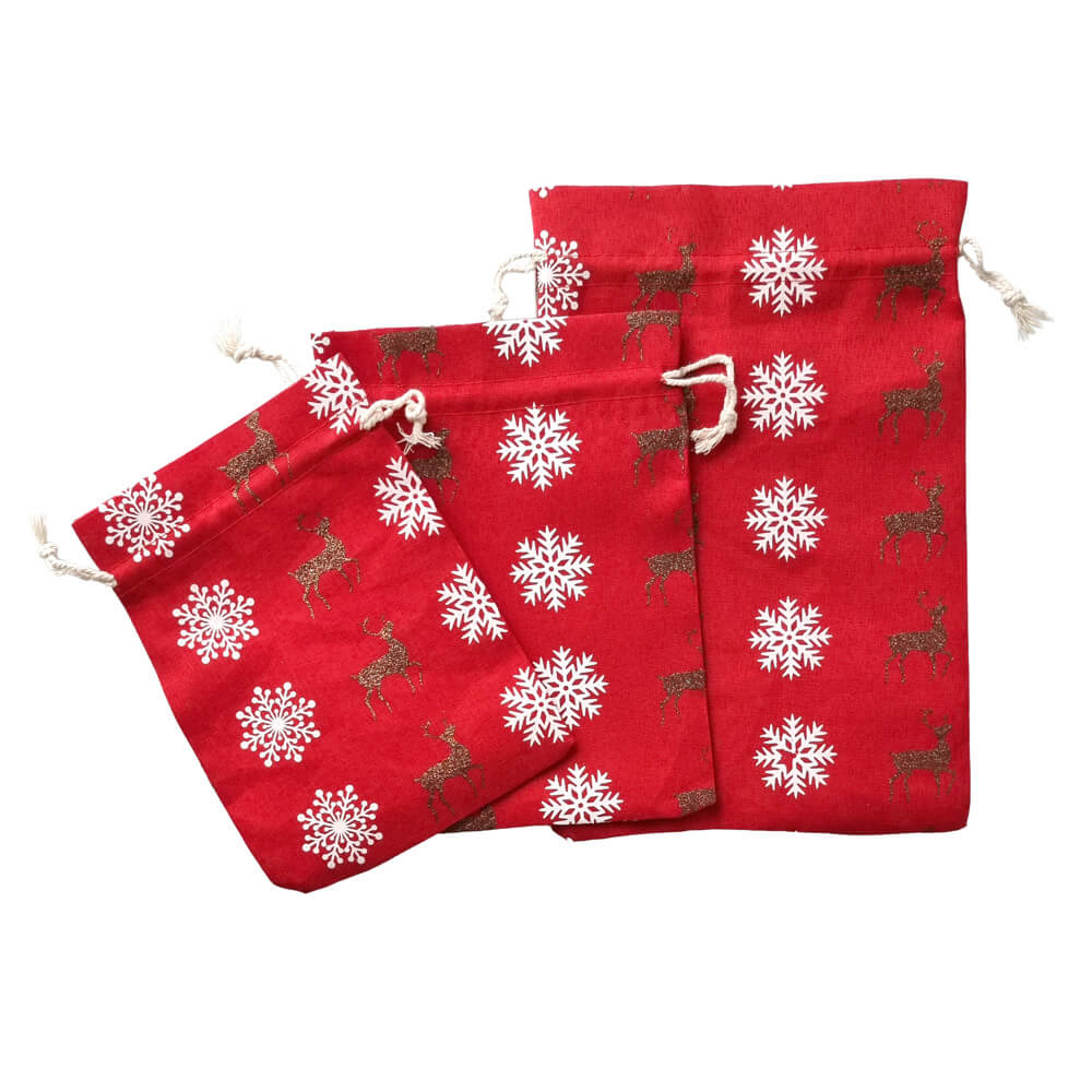 Wrap your Christmas gifts in the authentic spirit of the Holidays! Our festive red fabric bag, printed with a classic snowflake and reindeer design, is the perfect packaging for gifts placed under the tree with love.