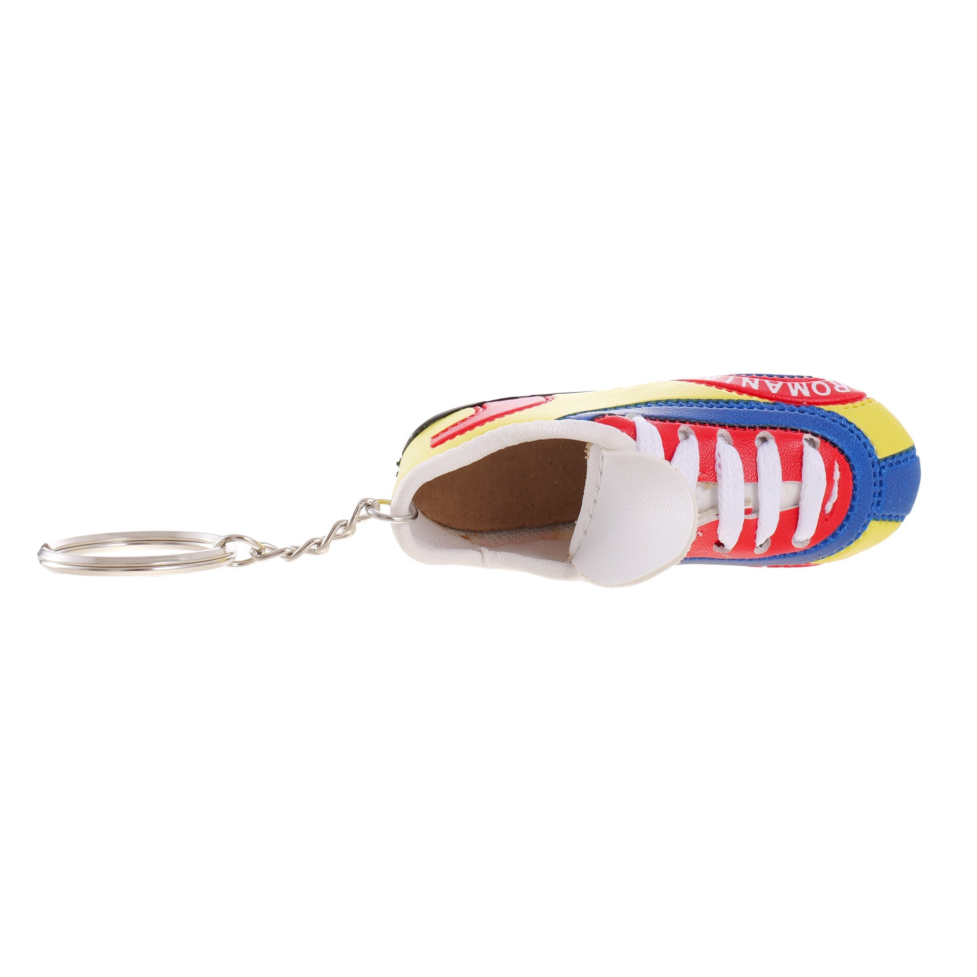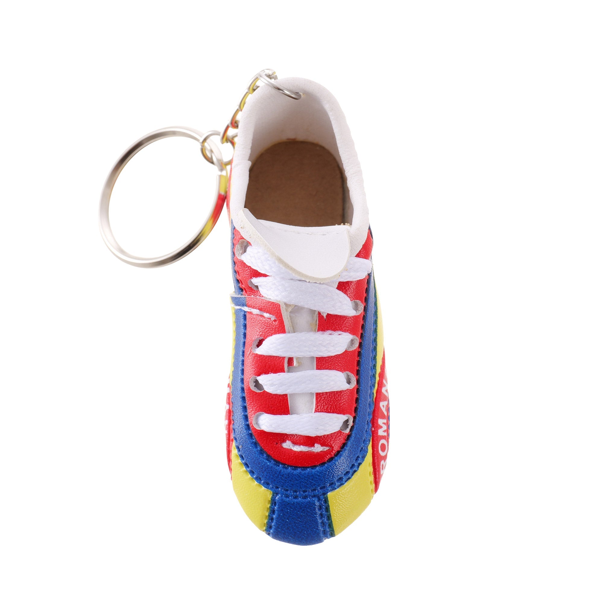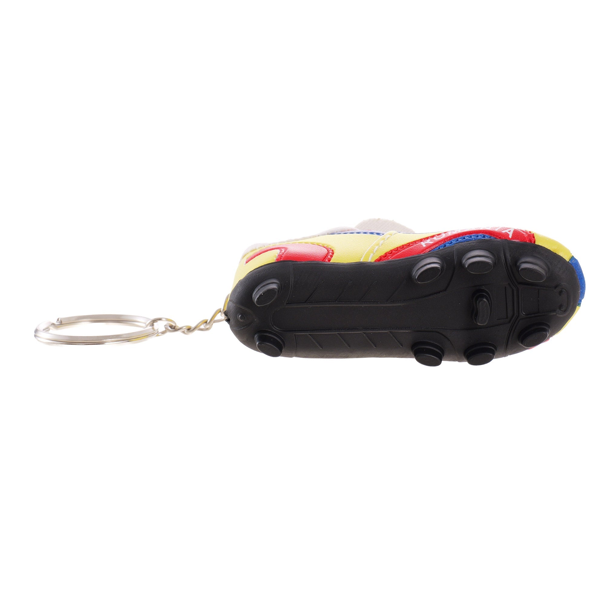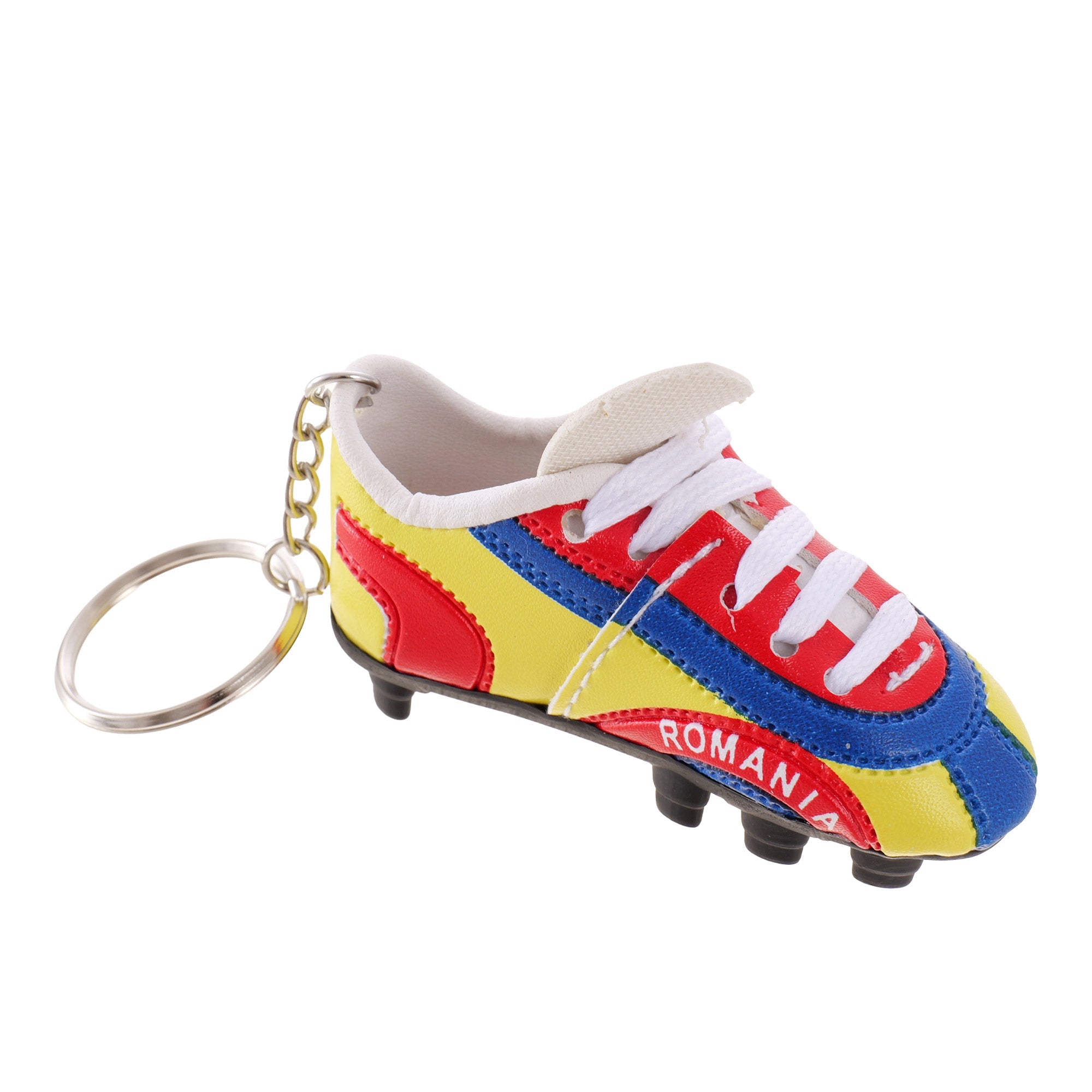 Keychain in the shape of a football boot, decorated in the colors of the Romanian tricolor (red, yellow, blue) and inscribed with "ROMANIA". It is a compact and effective accessory, perfect for passionate football fans and those who want to express their national pride.