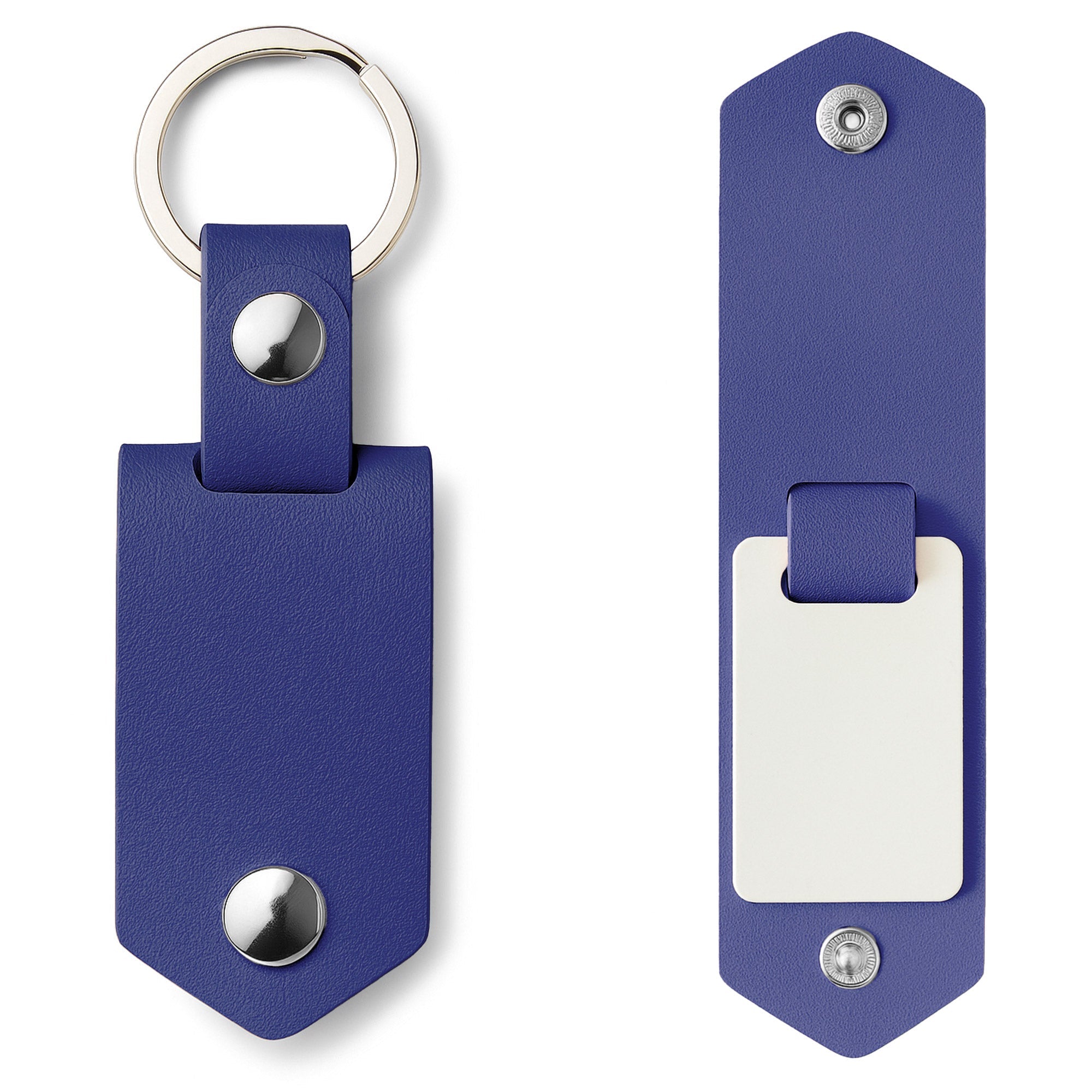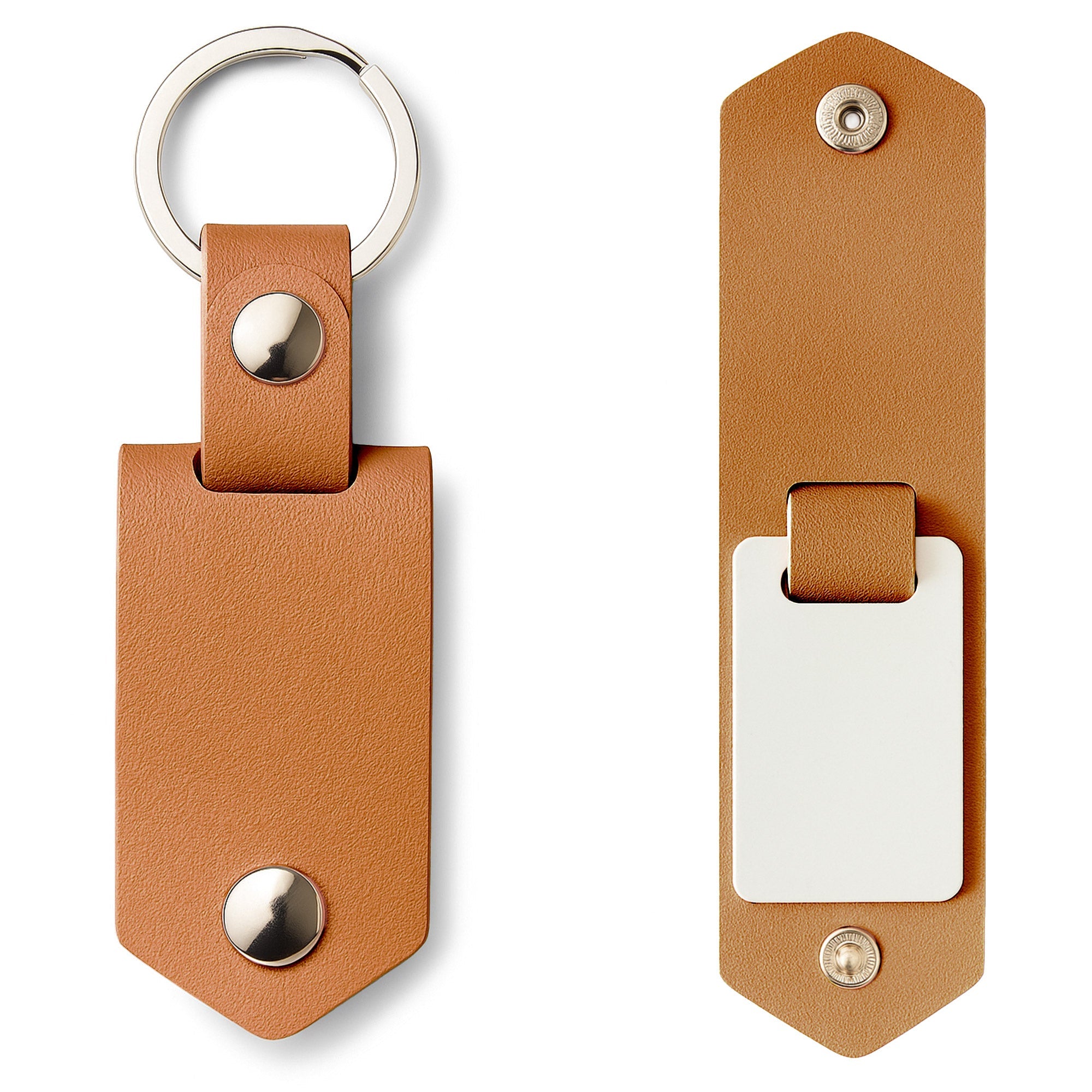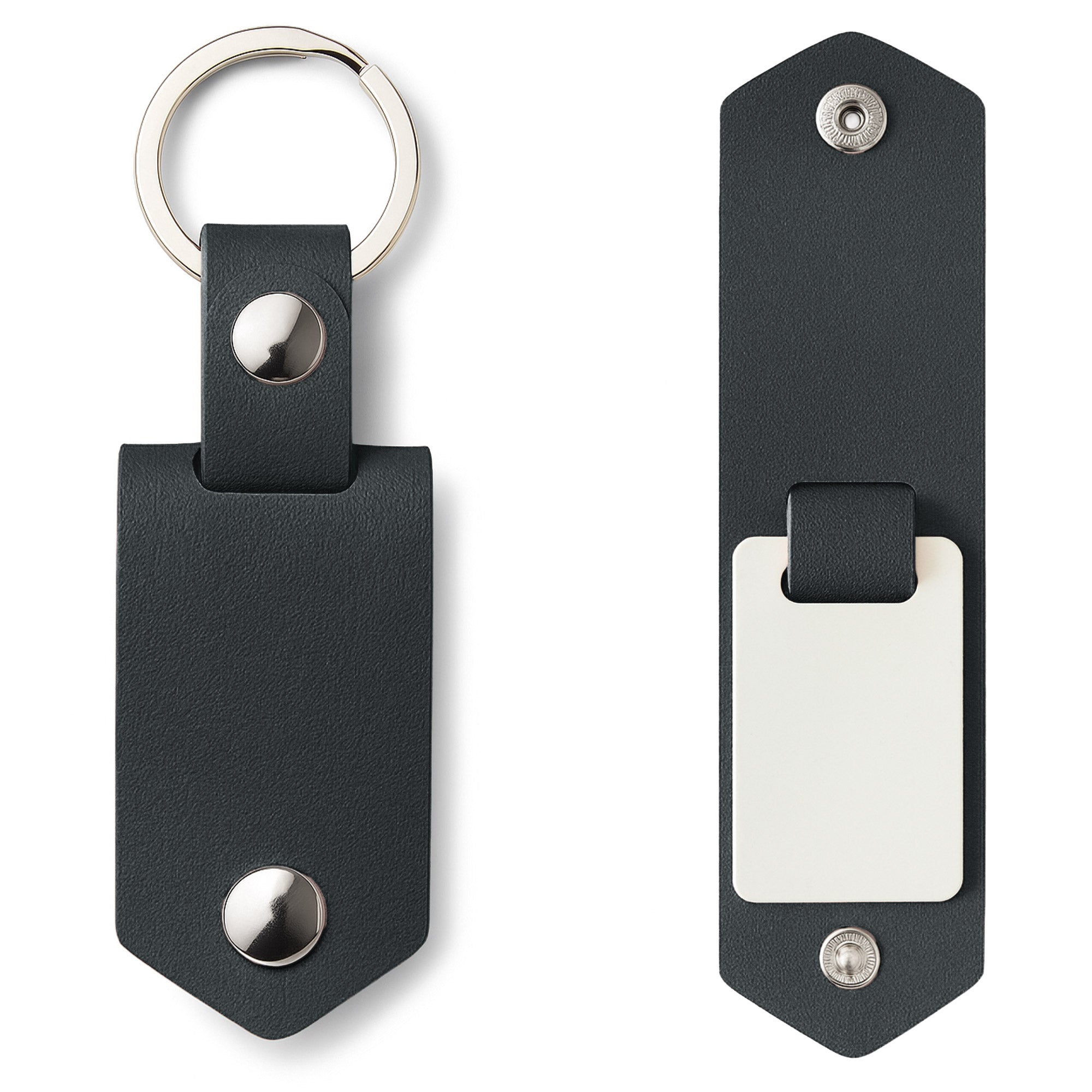 Breloc promotional cu placuta metalica de subliare, prevazut cu o husa din piele ecologica si insertie metalica dublu fata