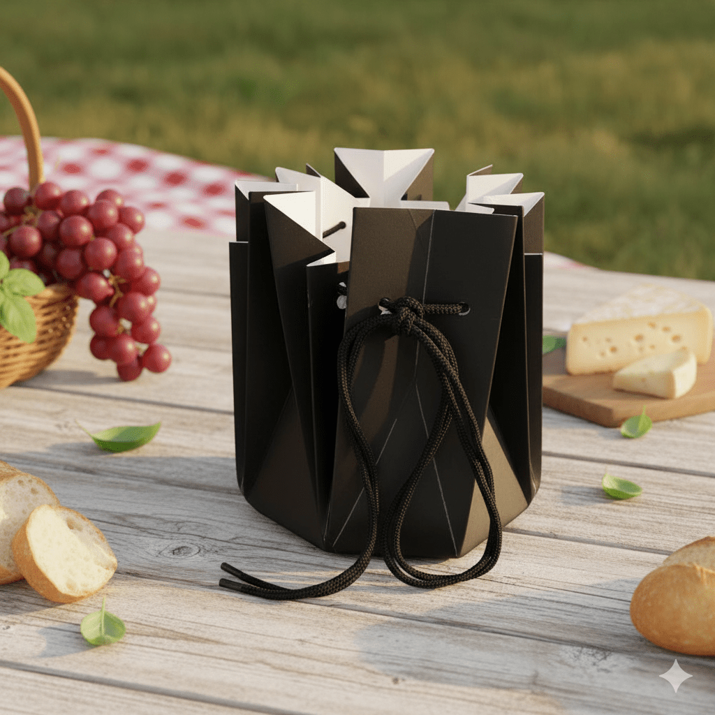 • Închidere Practică și Decorativă cu Șnur: Șnurul asortat permite închiderea rapidă și sigură a cutiei, strângând pliurile într-o formă elegantă de floare. Acesta servește și ca mâner pentru un transport facil.