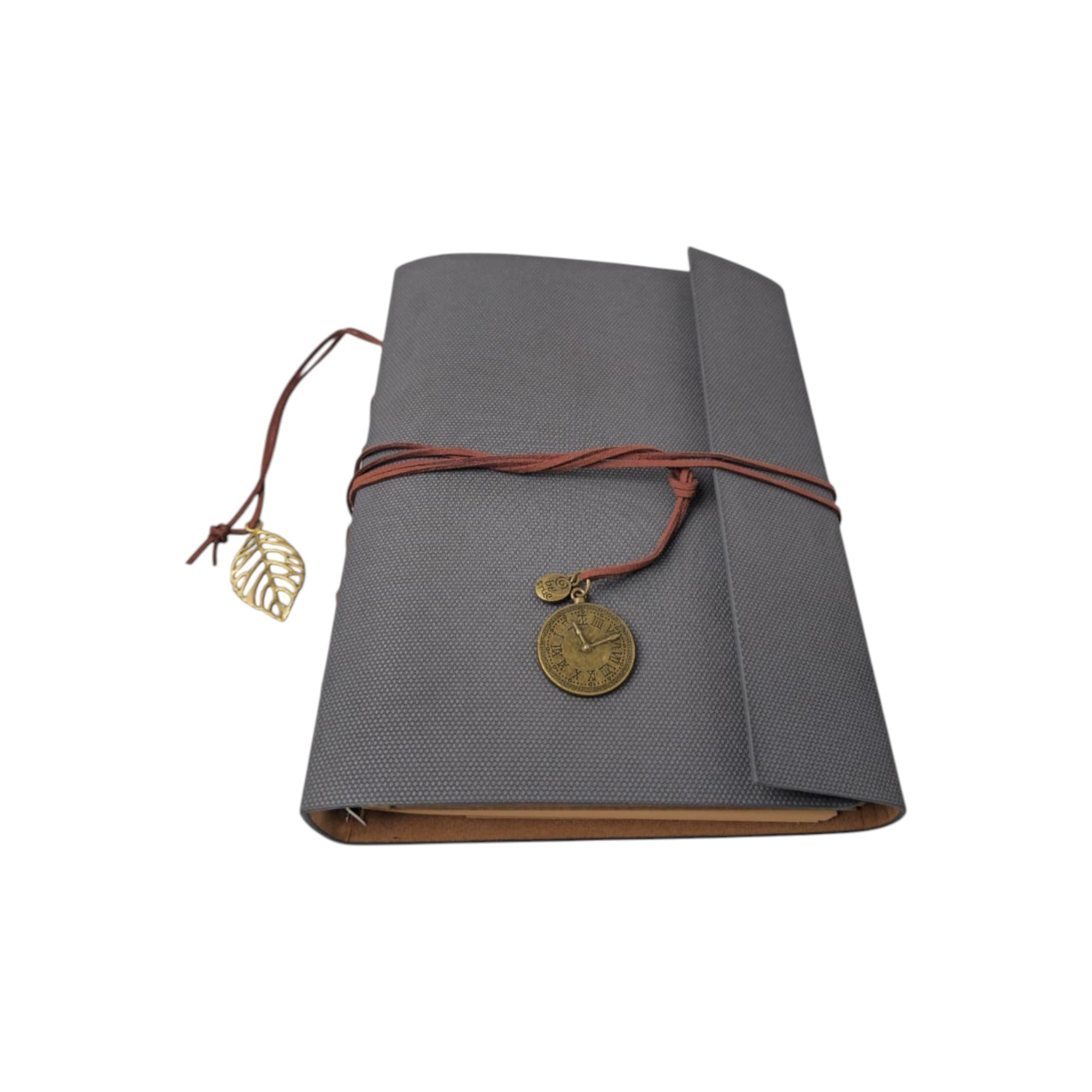 Capturați-vă gândurile, planurile sau amintirile din călătorii în această agendă cu design vintage. Sistemul de închidere cu șnur și pandantivele metalice îi oferă un aspect distinct, transformând-o într-un obiect personal sau un cadou deosebit.