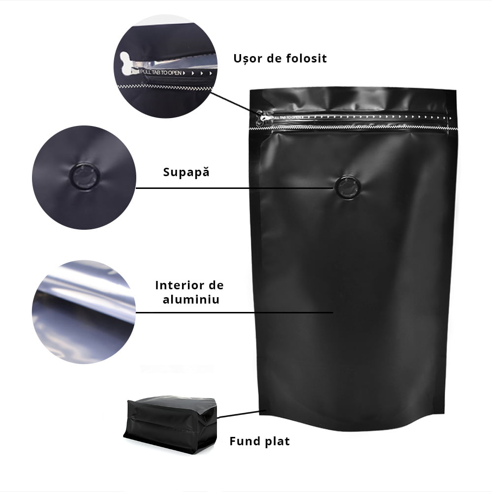 Pungi stand up opace reutilizabile cu supapă și fermoar - negru, soluția versatilă pentru ambalarea și păstrarea produselor tale.