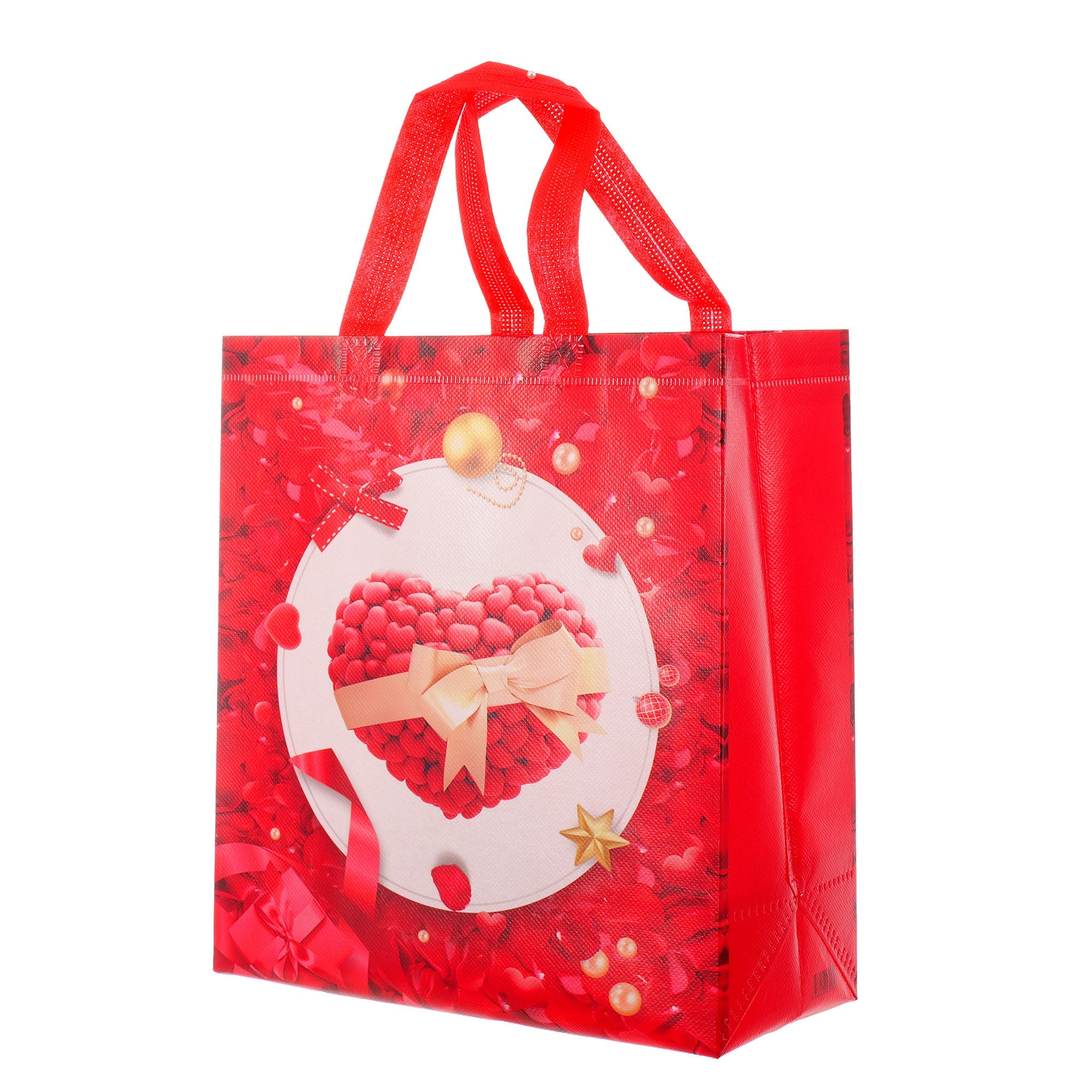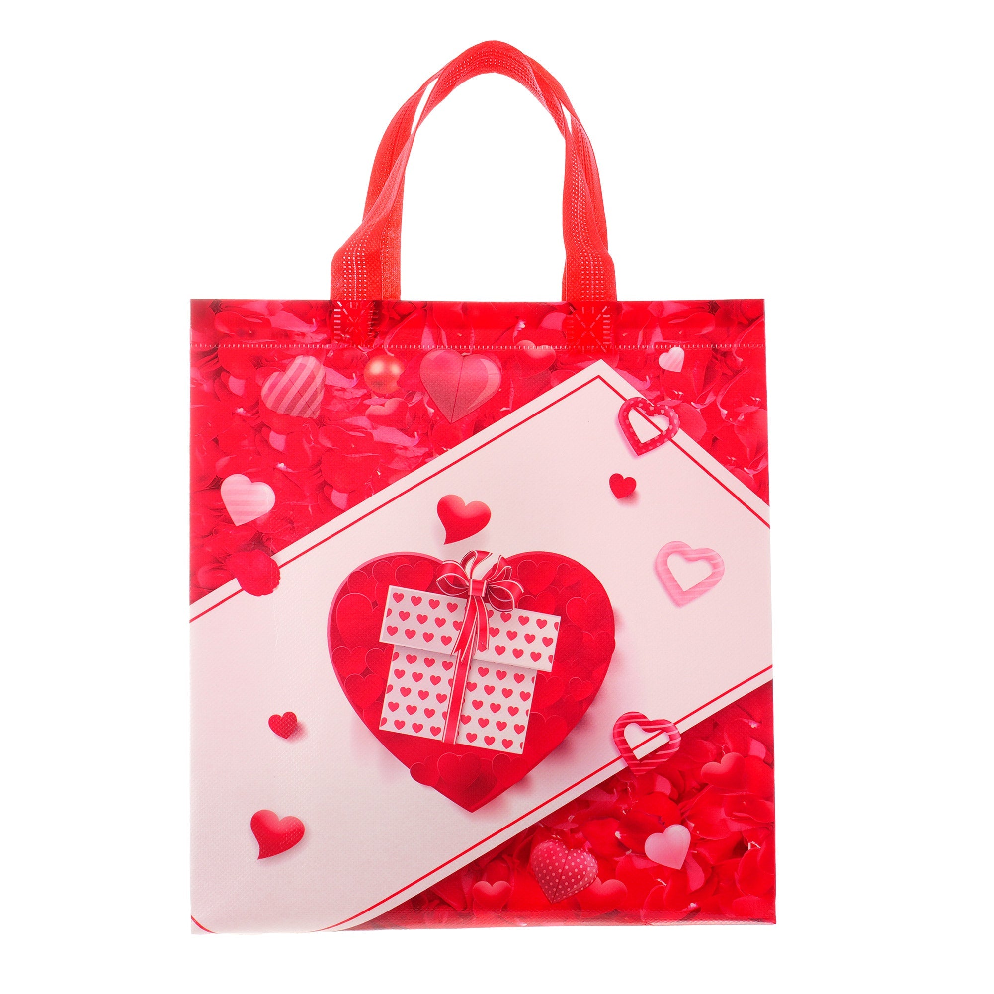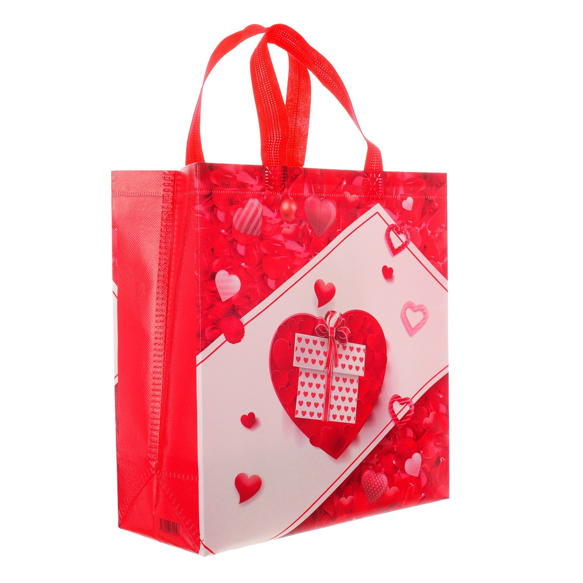 Sacoșă textilă reutilizabilă cu tematică de Valentine’s Day, realizată din polipropilenă netesută (non-woven), un material rezistent și ușor, ideal pentru ambalarea cadourilor de Ziua Îndrăgostiților. Dimensiunea de 29 × 27 × 12 cm oferă suficient spațiu pentru cadouri variate, iar baza lată de 12 cm îi permite să stea în picioare, fiind practică și elegantă.
