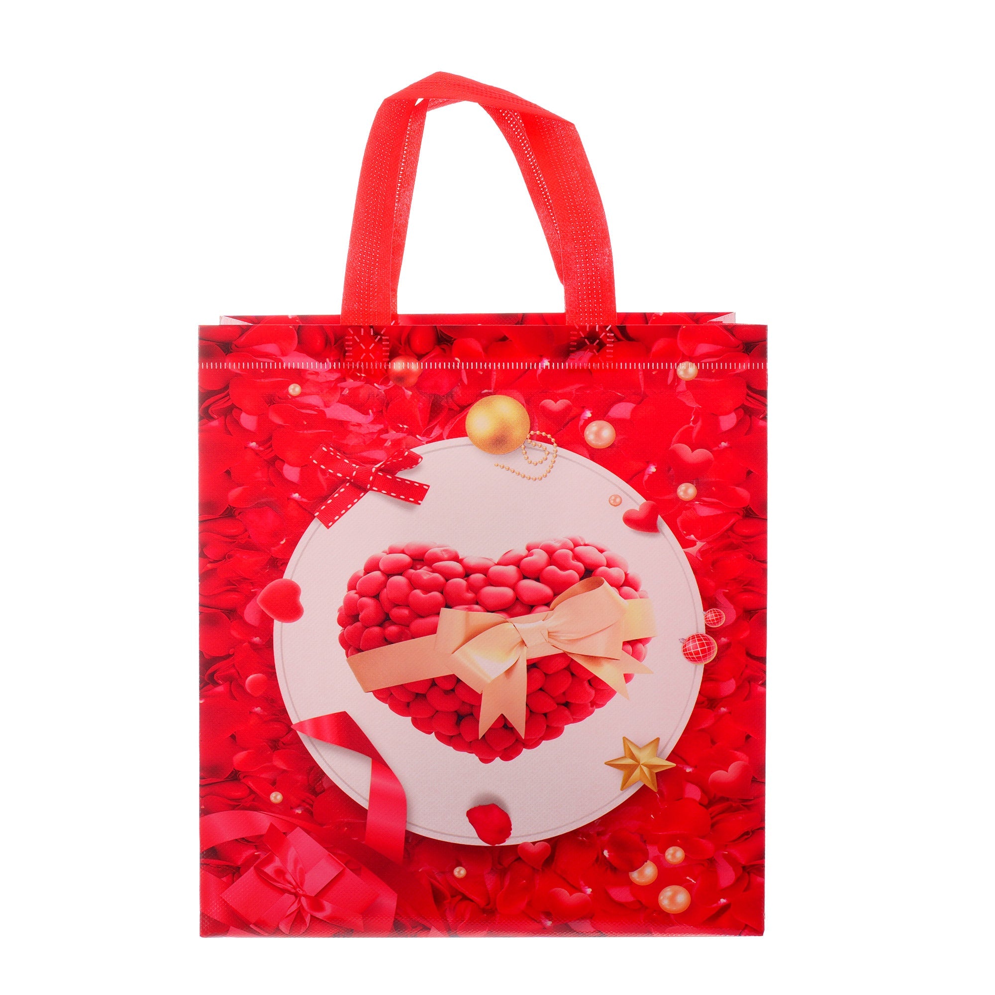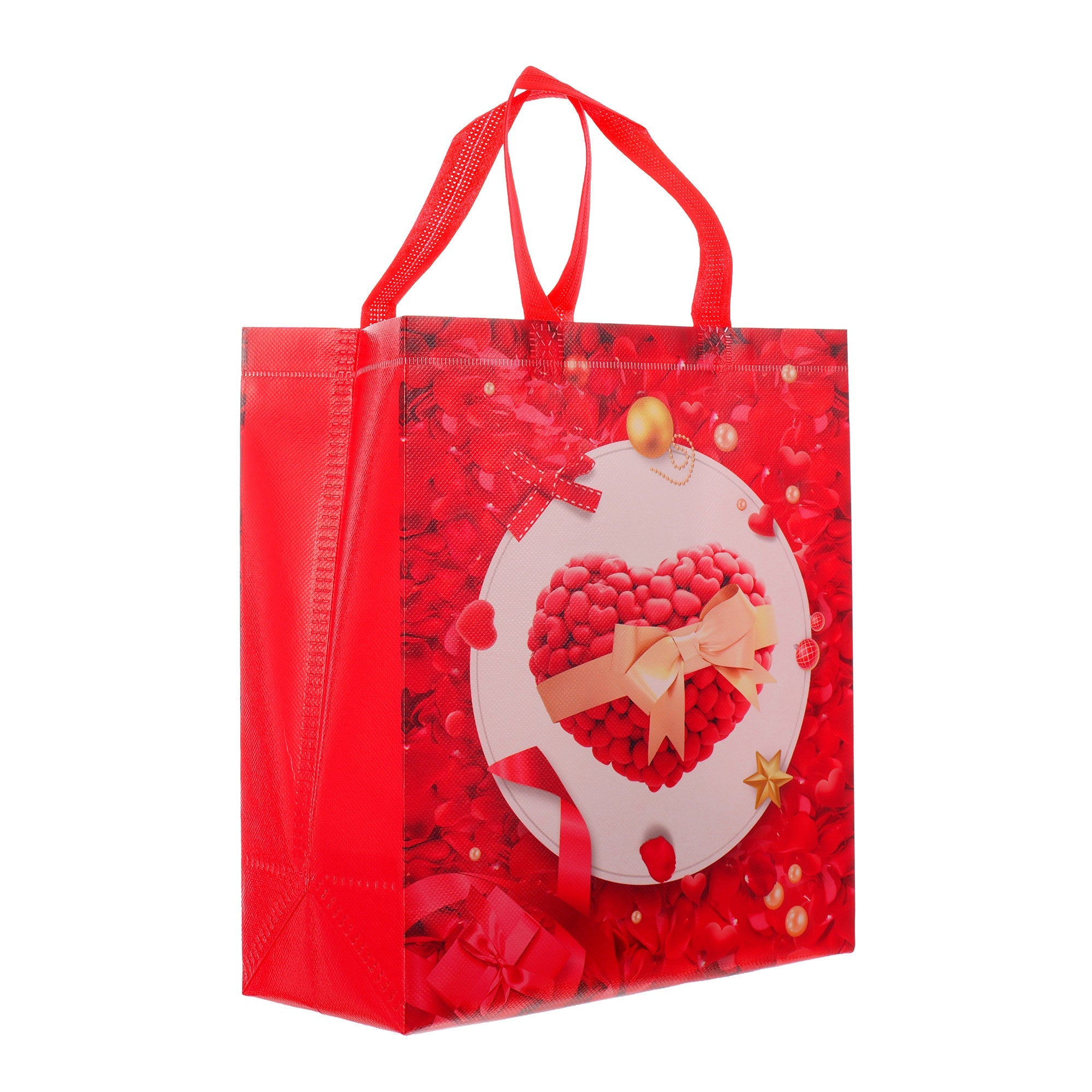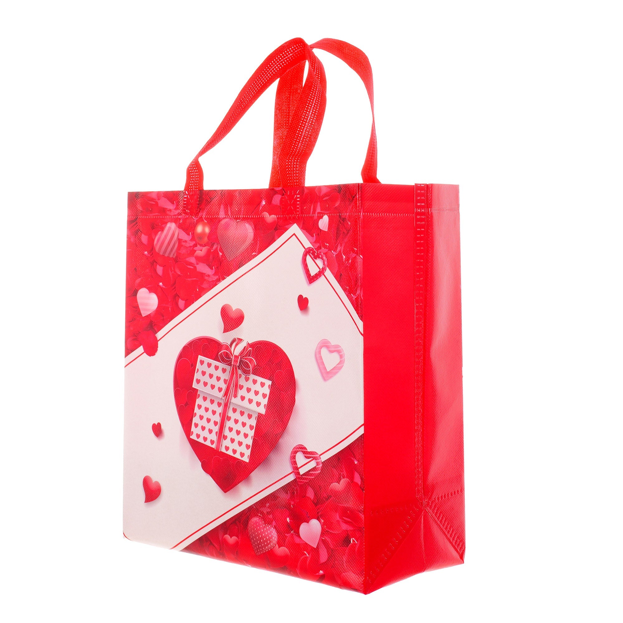 Sacoșă textilă reutilizabilă cu tematică de Valentine’s Day, realizată din polipropilenă netesută (non-woven), un material rezistent și ușor, ideal pentru ambalarea cadourilor de Ziua Îndrăgostiților. Dimensiunea de 29 × 27 × 12 cm oferă suficient spațiu pentru cadouri variate, iar baza lată de 12 cm îi permite să stea în picioare, fiind practică și elegantă.