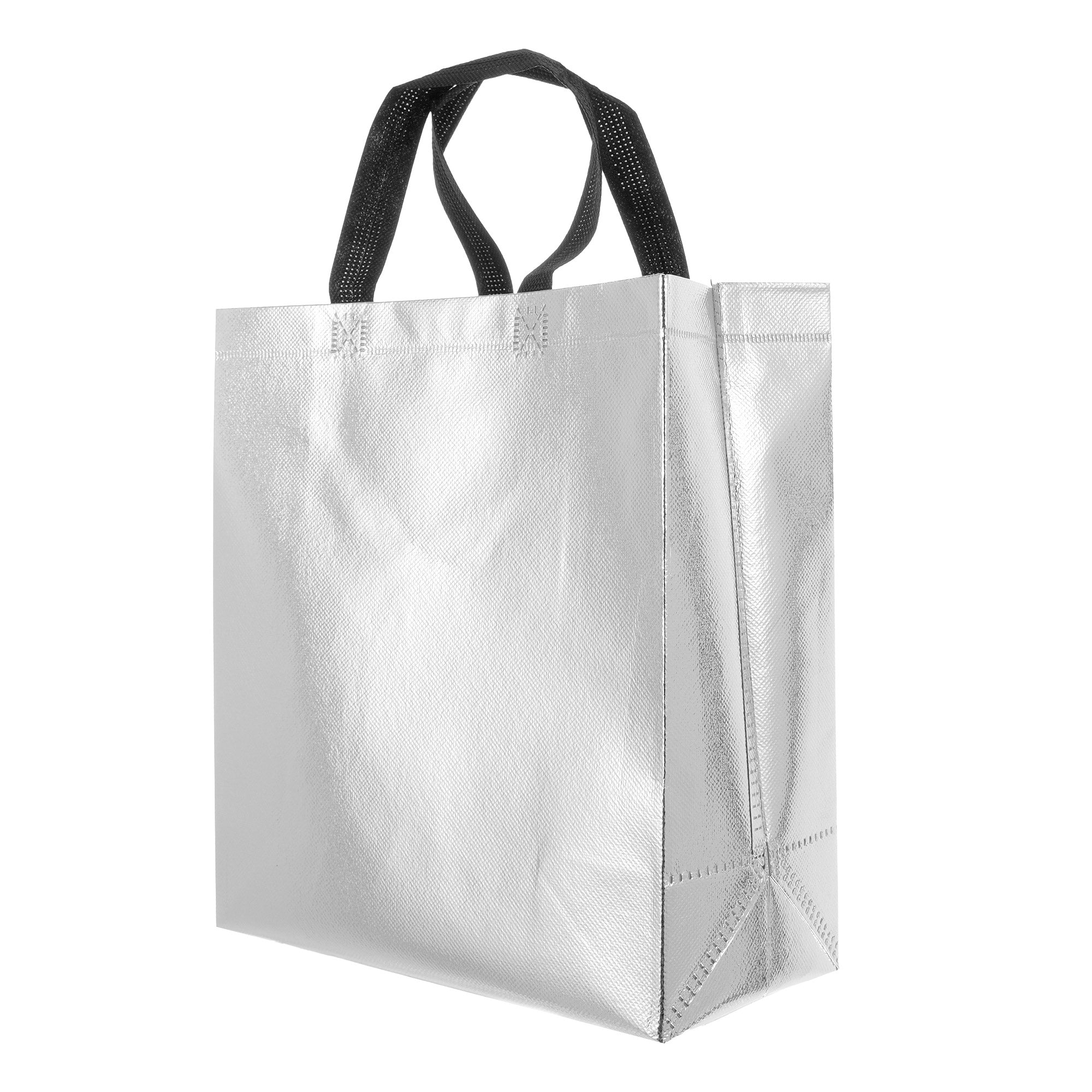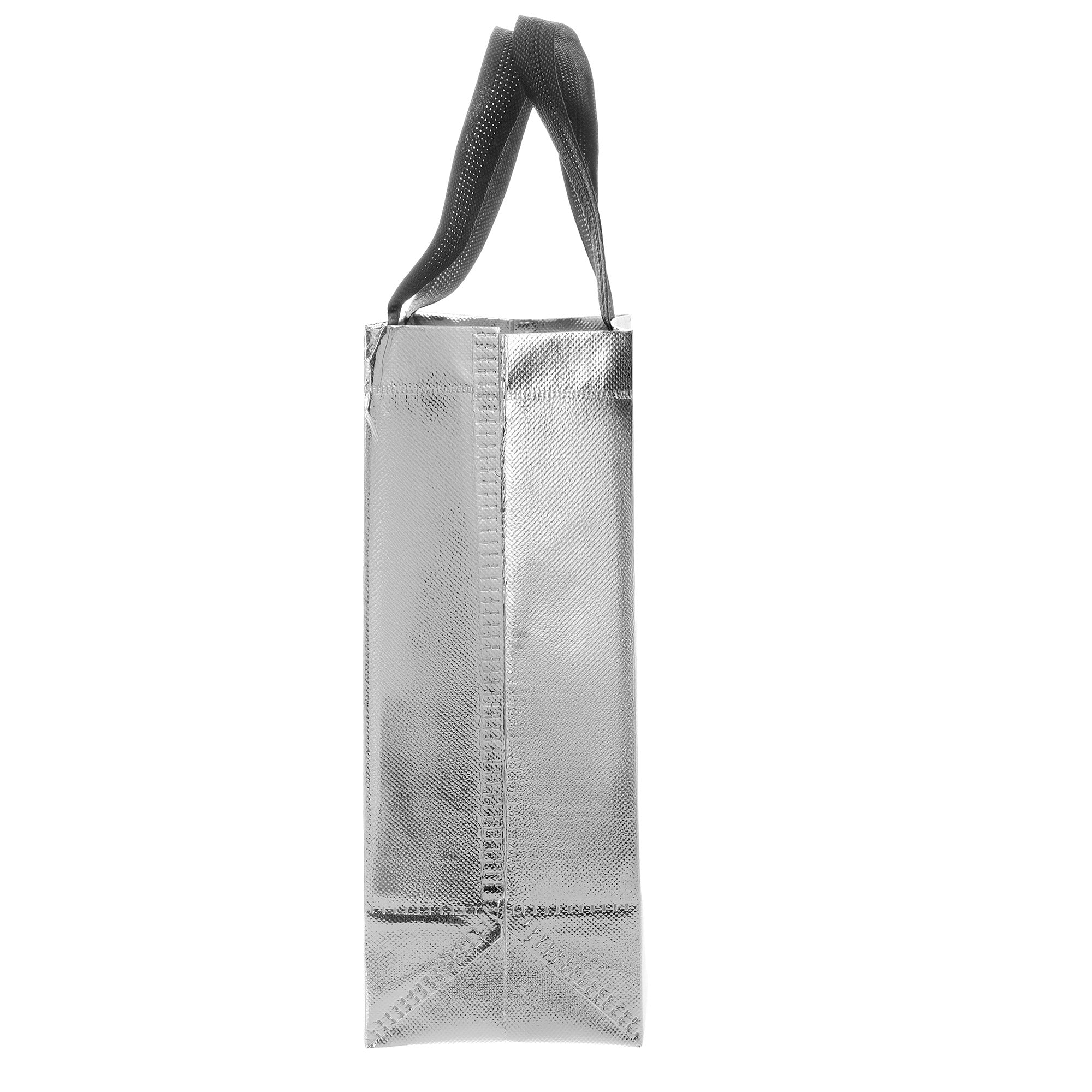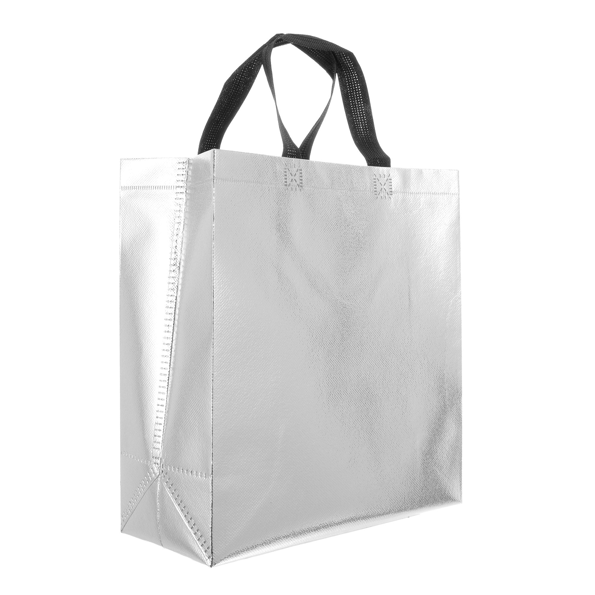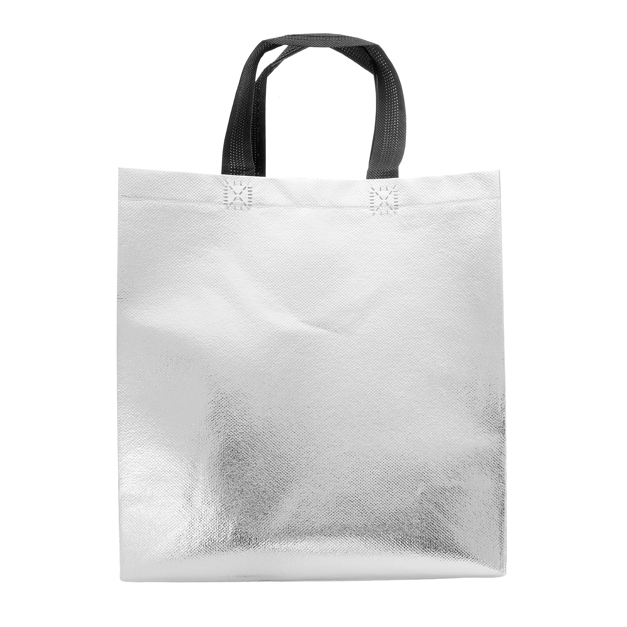 Sacoșă textilă reutilizabilă cu finisaj metalic, lucios, realizată din polipropilenă netesută (non-woven). Este rezistentă, ușoară și practică, ideală atât pentru cadouri, cât și pentru utilizare zilnică. Datorită dimensiunii de 29 × 27 × 12 cm și bazei late de 12 cm, sacoșa este concepută să stea în picioare, oferind stabilitate și un aspect premium.