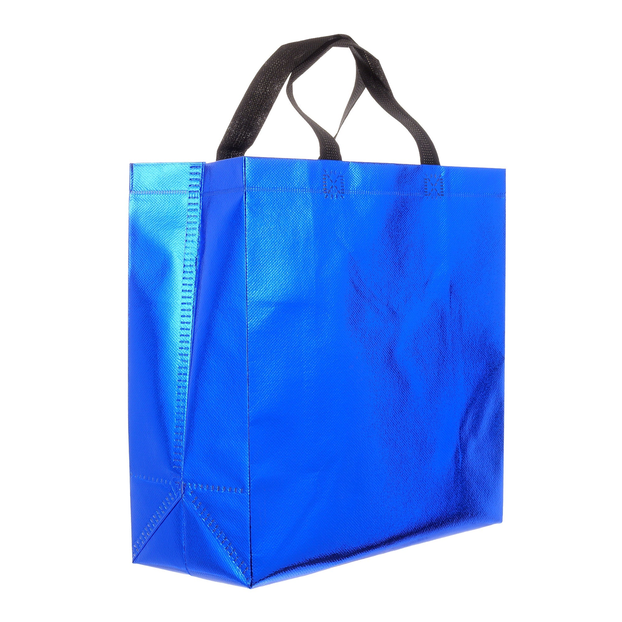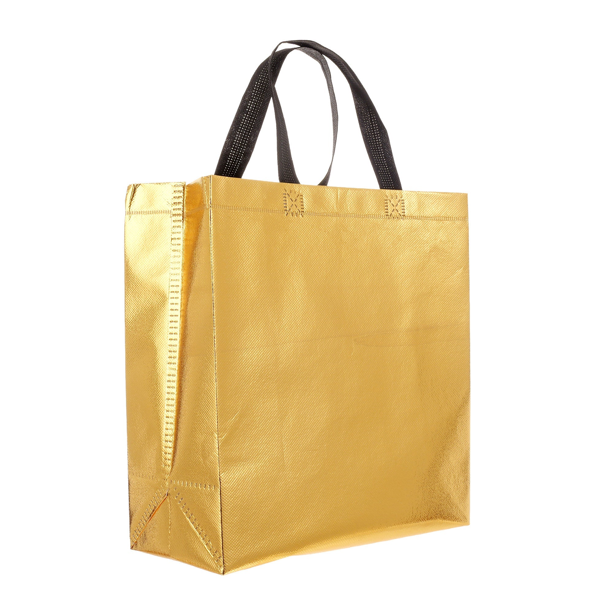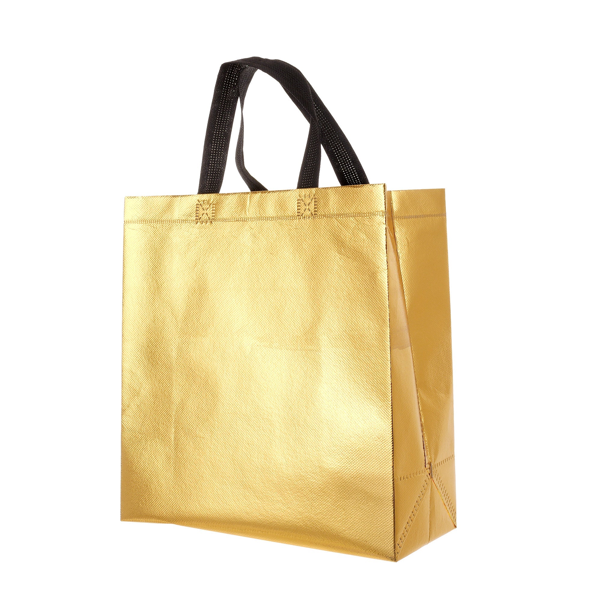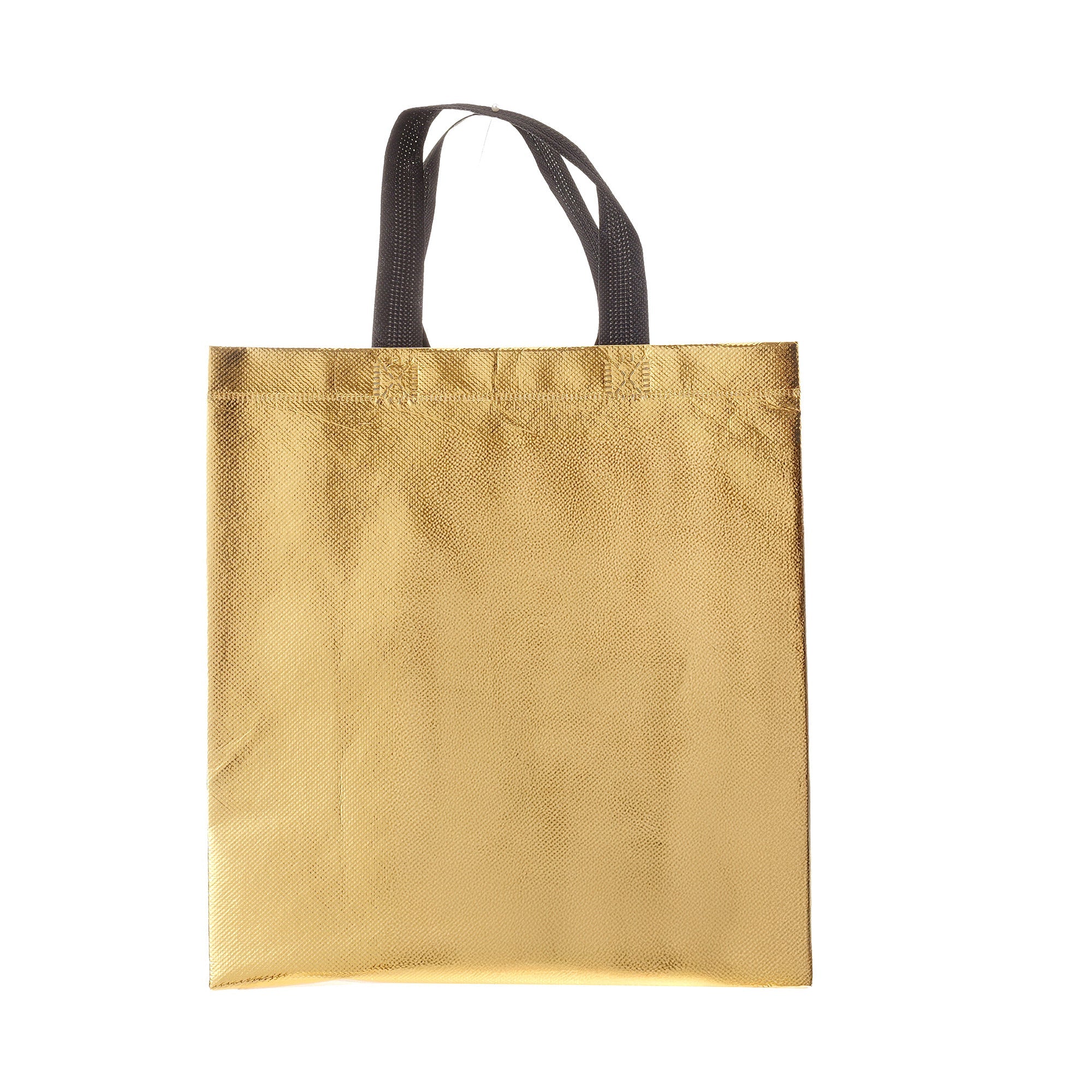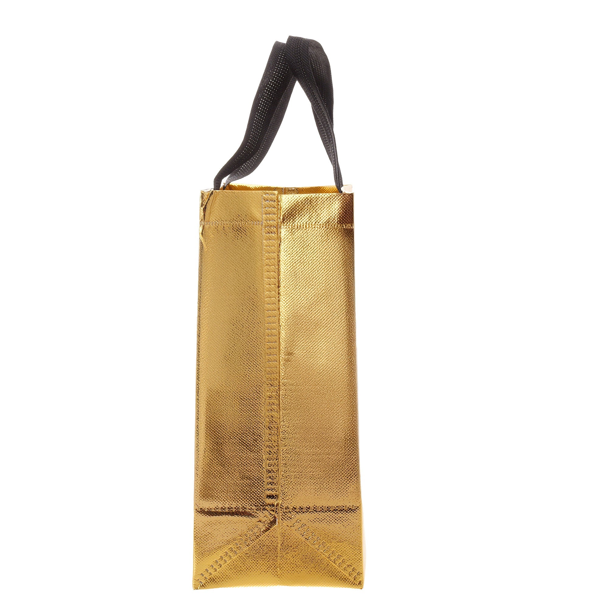 Sacoșă textilă reutilizabilă cu finisaj metalic, lucios, realizată din polipropilenă netesută (non-woven). Este rezistentă, ușoară și practică, ideală atât pentru cadouri, cât și pentru utilizare zilnică. Datorită dimensiunii de 29 × 27 × 12 cm și bazei late de 12 cm, sacoșa este concepută să stea în picioare, oferind stabilitate și un aspect premium.