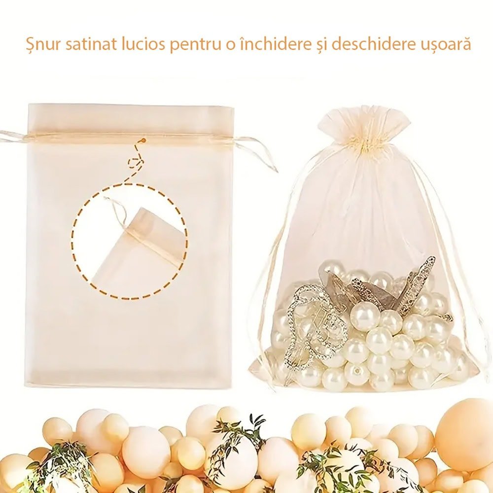 - Organza Fină și Translucidă: Materialul ușor și semitransparent adaugă o notă de rafinament și permite conținutului să fie întrezărit. Este disponibil într-o paletă largă de culori pentru a se asorta oricărei tematici.