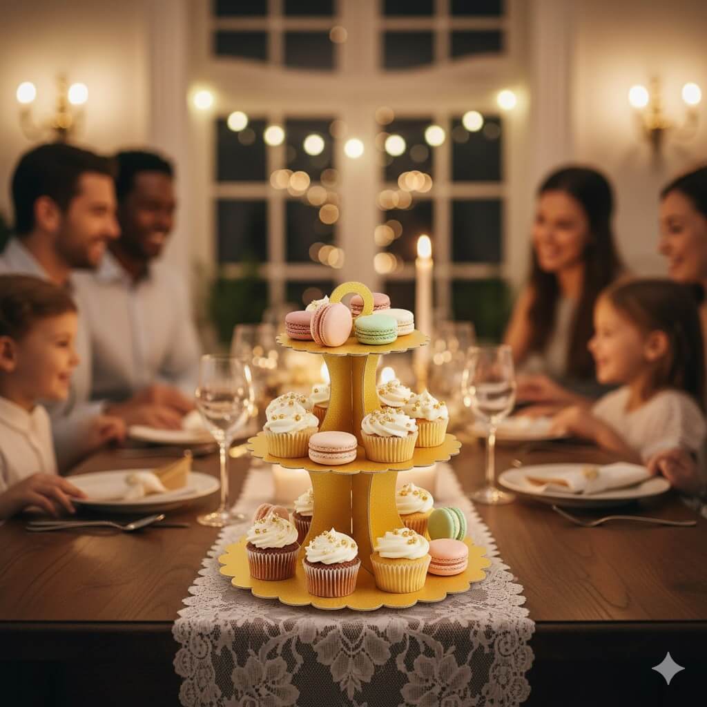 • 3 niveluri circulare: Oferă spațiu generos pentru prăjituri, brioșe sau gustări.