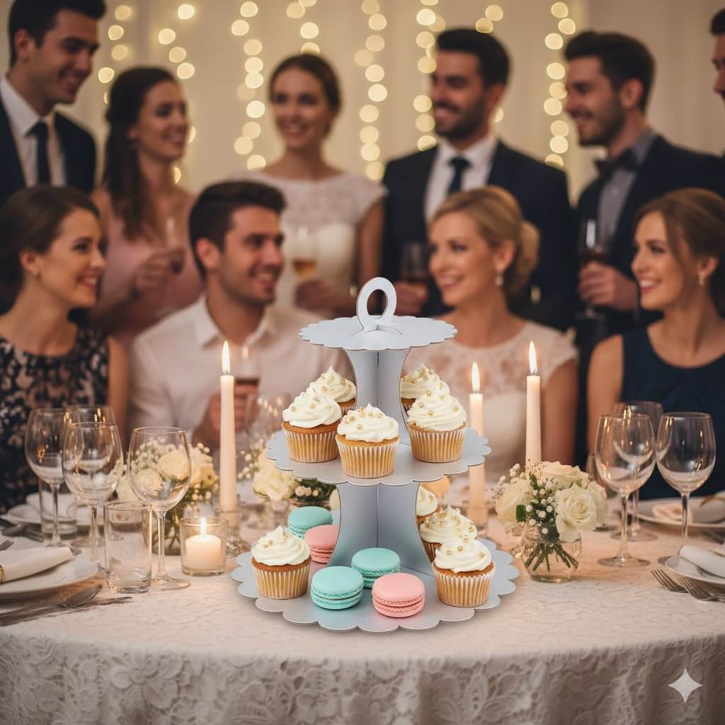 Este soluția practică și elegantă pentru servirea prăjiturilor, brioșelor sau gustărilor. Ideal pentru petreceri, evenimente sau candy bar-uri, se montează rapid și adaugă un plus de stil mesei tale festive.